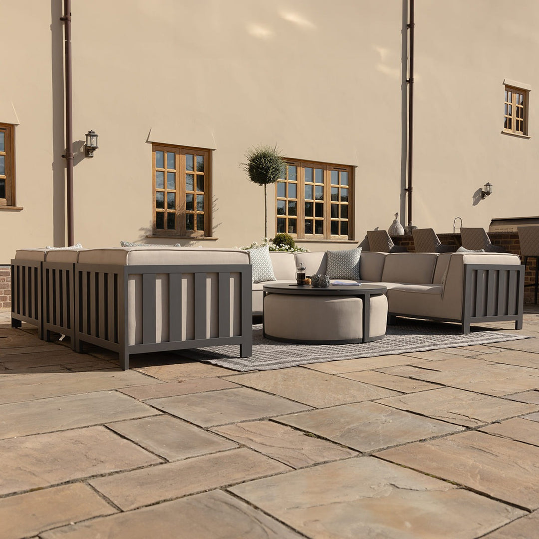 The Maze Ibiza U-Shape Sofa Set is a luxurious and adaptable modular seating solution, designed to elevate your outdoor living space. Finished in a sleek oatmeal outdoor fabric, this set exudes modern elegance while offering exceptional versatility. The modular design allows for a wide range of configurations, using the corner and centre pieces to create the perfect setup for any occasion.Complementing the sofa is a stylish round coffee table, designed with both form and function in mind. Nested underneath the table are three triangular footstools, wrapped in the same high-quality fabric as the sofa. These footstools can be used for additional seating, as footrests, or conveniently stored beneath the table when not in use. Built with weather-resistant materials and plush cushions, the Maze Ibiza U-Shape Sofa Set combines comfort, flexibility, and sophistication for the ultimate outdoor experience.Please note: Individually winter covers are supplied to protect each piece of furniture (excluding table).