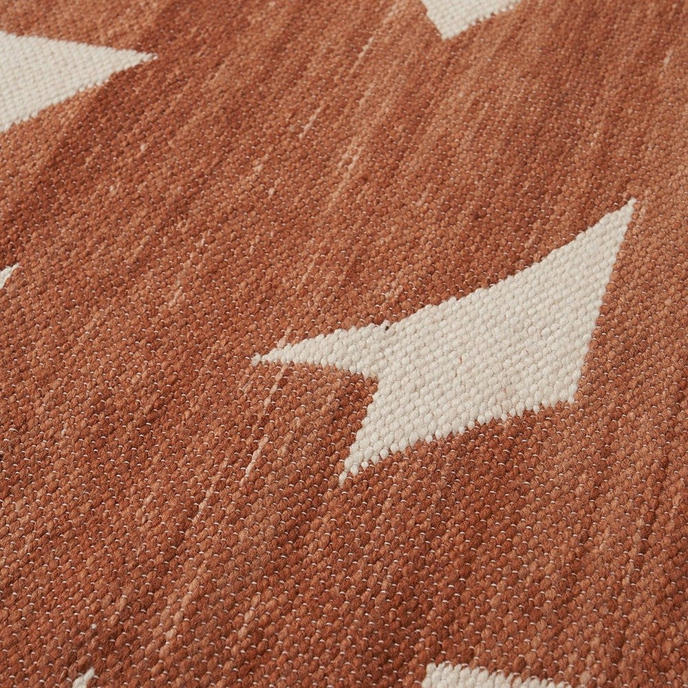 The range of indoor and outdoor rugs are made from recycled plastics, that are cleverly presented in thin threads of polyester yarn enabling our weavers in India to manufacture them into textured, yet non-absorbent rugs. This particular contemporary design rectangular rug, makes use of a stunning geometric pattern in terracotta and ivory, ideal for adding a pop of colour to Scandi or modern décor. As this material is non-absorbent, it means you can happily use this ivory rug outside and gently wash or brush off the dirt when needed, however during prolonged periods of inclement weather, it is advisable to allow this rug to dry under cover when not in use. In addition, this rug can also be used indoors and is especially useful in high traffic or well used areas due to its durable qualities and ease of maintenance.