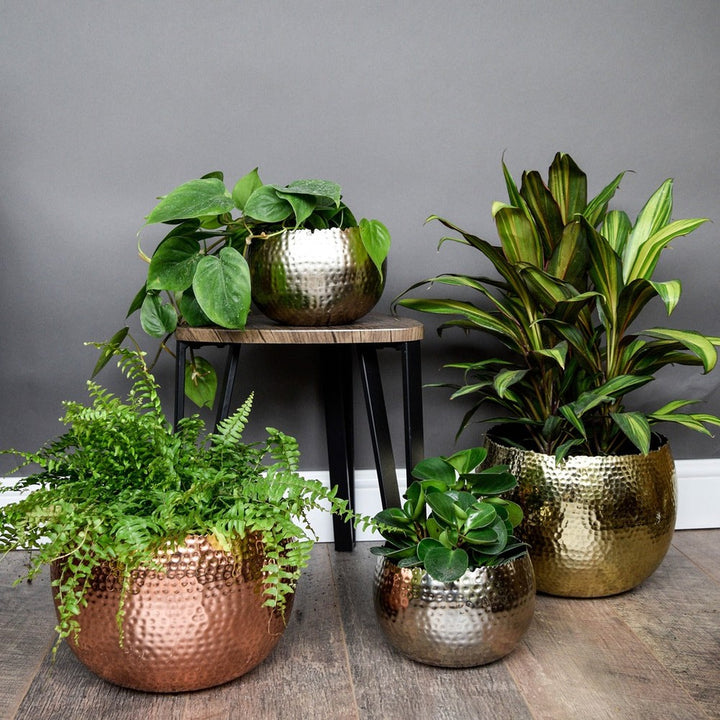 A contemporary accent piece with industrial elements, our hammered bowl in Copper/Black is perfect for creating an on-trend interior scheme. Whether styled alone or with lush blooms and greenery, this waterproof planter makes a stylish impression in the home place, with its high-shine finish wonderfully catching the light for an extra dose of splendour.