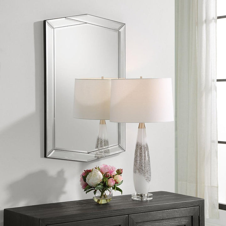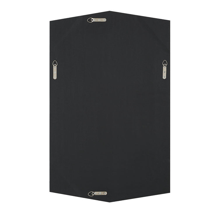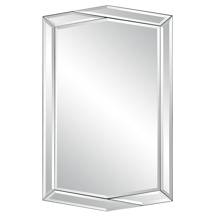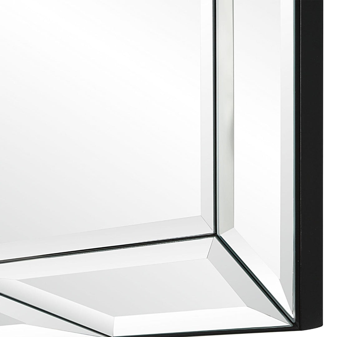 The Keiichi Constance Mirror redefines modern elegance with its asymmetrical design. Featuring offset top and bottom panels that form a distinctive diamond peak, this mirror adds a contemporary flair to any room. The side panels and a .5" beveled center mirror are complemented by a sleek black frame, making it an excellent choice for placement over vanities or as a statement piece in hallways.