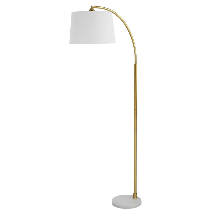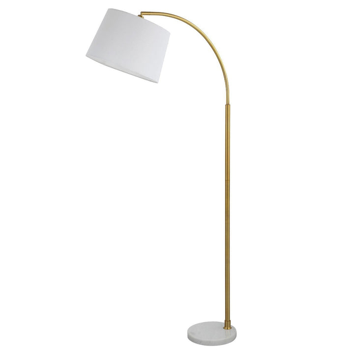 The Keiichi Dolores Floor Lamp combines contemporary aesthetics with practical functionality. This floor lamp features a sweeping metal arc finished in gold, anchored by a sturdy white marble base that adds a touch of luxury. The tapered white linen shade is adjustable, allowing you to direct light exactly where needed. Perfect for reading corners, living rooms, or any space that needs a stylish lighting solution.