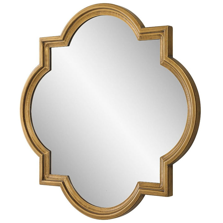 The Keiichi Eastern Mirror Gold Finish showcases a unique quatrefoil frame that adds a sophisticated touch to any room. Finished in gold with a gray glaze that accentuates the curves and straight lines, this mirror is perfect for entryways, living rooms, or bedrooms. The elegant design brings depth and character, making it a beautiful focal point in traditional or contemporary settings. The 1" beveled mirror adds a touch of refinement and completes the luxurious look.