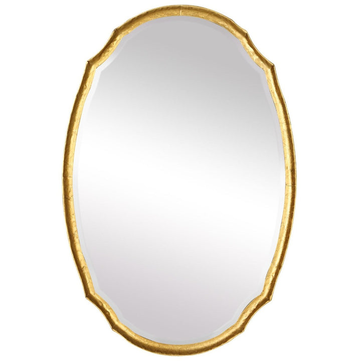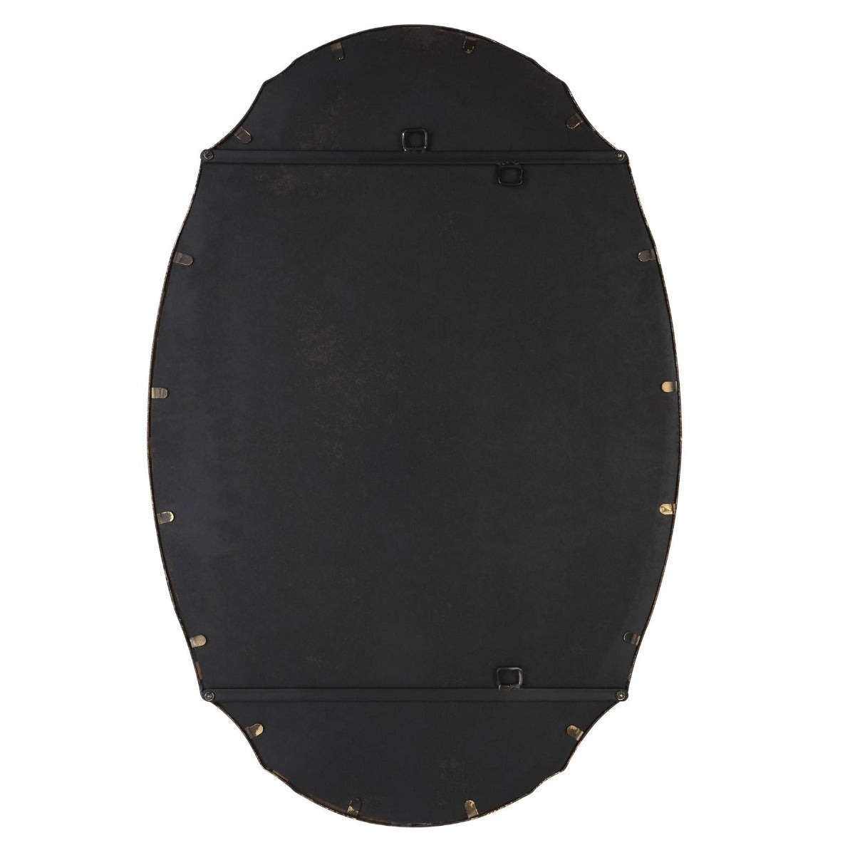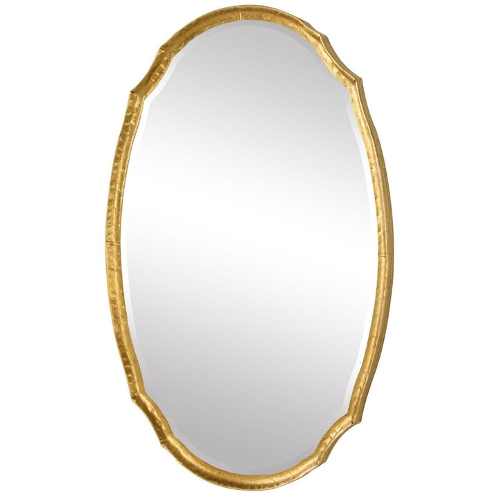 The Keiichi Eleanor Mirror Gold showcases an elegant oval-shaped frame made from hammered metal with a concave surface, finished in a lightly antiqued gold leaf. The mirror features a 1.25" bevel, adding depth and sophistication. It can be displayed vertically or horizontally, making it perfect for use over vanities, in hallways, or as a statement piece in living areas. This luxurious mirror elevates the aesthetic of any space with its refined details.