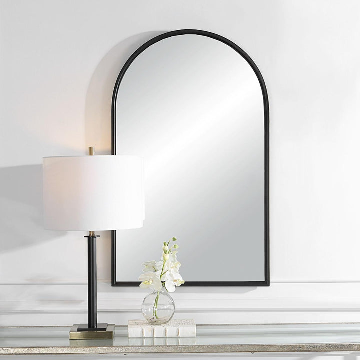 The Keiichi Florence Mirror Black features a sleek arch-top frame that brings a touch of modern elegance to your space. Finished in a rich matte black, this iron-framed mirror is perfect for adding depth and light to any room. Its minimalist design allows it to blend effortlessly with various decor styles, whether contemporary or transitional. Hang it vertically or horizontally over consoles, dressers, or bathroom vanities to create a stunning visual statement. Also available in gold leaf for those who prefer a warmer tone.