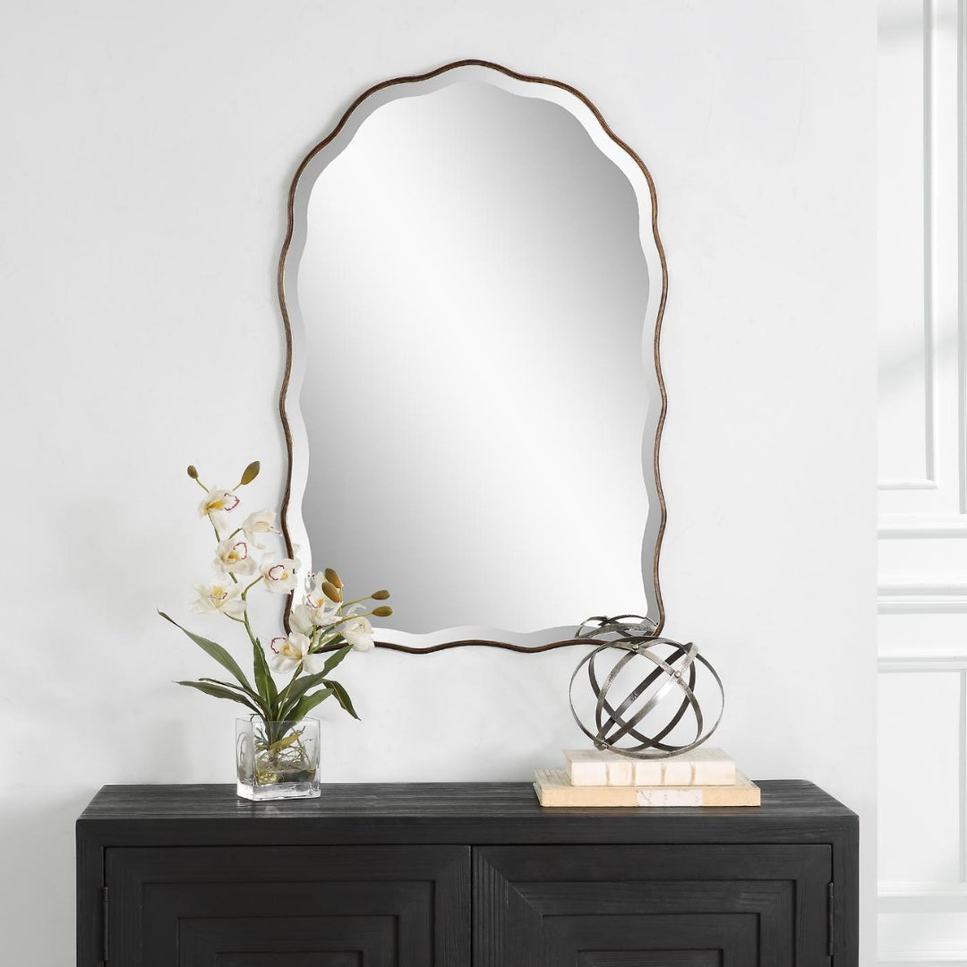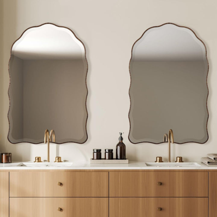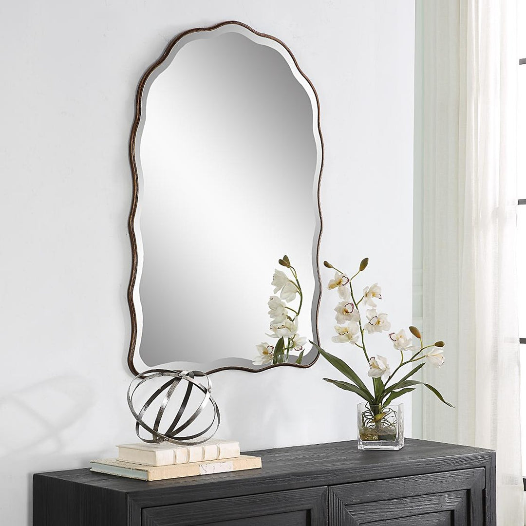 The Keiichi Irregular Mirror Antique Bronze stands out with its beautifully scalloped edges and feminine, delicate appearance. Finished in an antique bronze with gold highlights, this arch-top mirror adds a touch of warmth and luxury to any space. The 1" beveled mirror enhances its elegance and visual depth. Perfect for use in bedrooms, living rooms, or as an accent piece in a hallway, this mirror embodies Keiichi’s commitment to unique and high-quality design. The Irregular Mirror’s distinctive shape and finish make it a perfect choice for those looking to add a sophisticated focal point to their home.