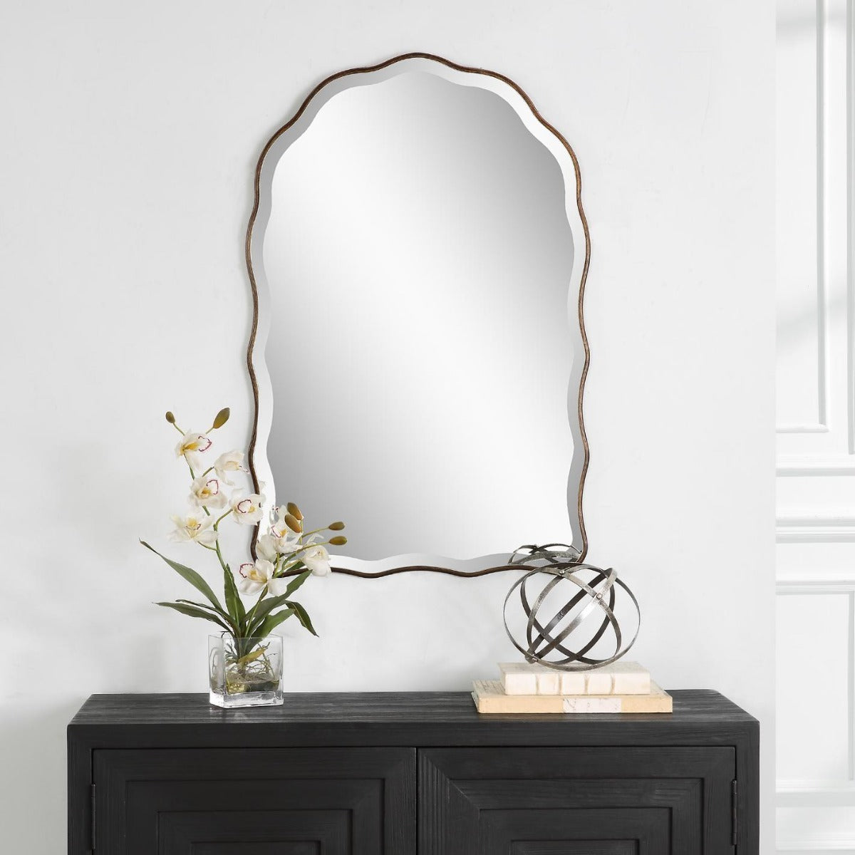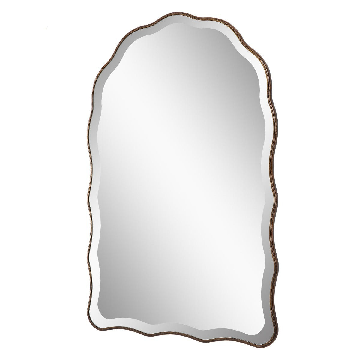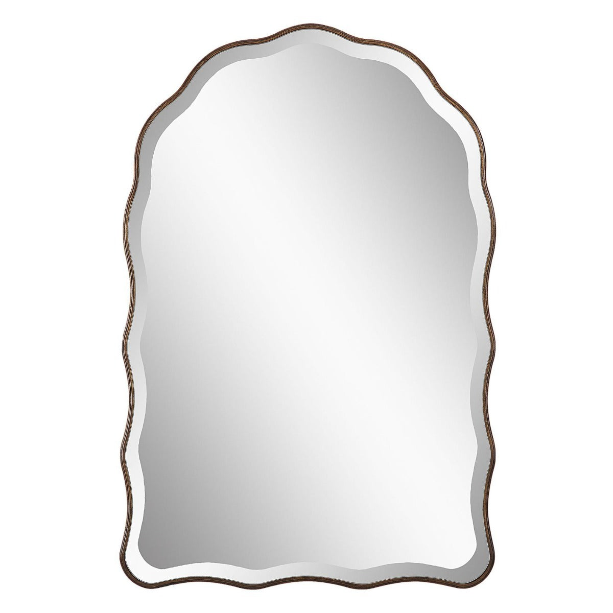 The Keiichi Irregular Mirror Antique Bronze stands out with its beautifully scalloped edges and feminine, delicate appearance. Finished in an antique bronze with gold highlights, this arch-top mirror adds a touch of warmth and luxury to any space. The 1" beveled mirror enhances its elegance and visual depth. Perfect for use in bedrooms, living rooms, or as an accent piece in a hallway, this mirror embodies Keiichi’s commitment to unique and high-quality design. The Irregular Mirror’s distinctive shape and finish make it a perfect choice for those looking to add a sophisticated focal point to their home.