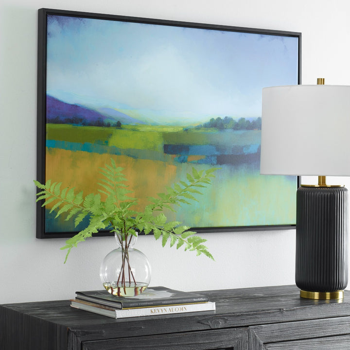 The Keiichi Morning Sunrise Framed Canvas captures the awe-inspiring beauty of dawn with its vivid colors and detailed depiction of expansive fields and rolling mountains in the distance. The piece, titled Morning Sunrise, evokes a sense of peace and wonder, making it a perfect addition to living rooms, bedrooms, or hallways that benefit from an artistic touch. The artwork is encased in a black, solid wood gallery frame that enhances its elegance and timeless appeal. This giclee canvas is handcrafted and printed in the USA, ensuring a high level of craftsmanship and detail. Whether you're a nature enthusiast or simply looking for a piece that adds warmth and visual interest, this canvas brings the serene atmosphere of a new day into your home. The work of artist Ja shines through in this carefully curated piece, embodying the Keiichi brand’s commitment to quality and style.