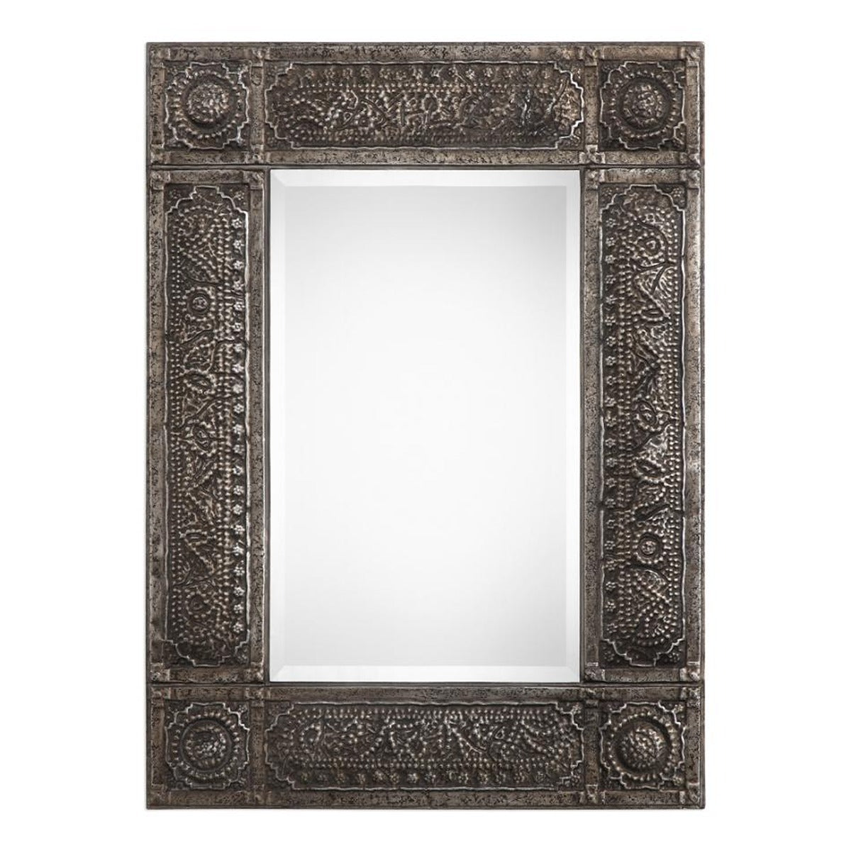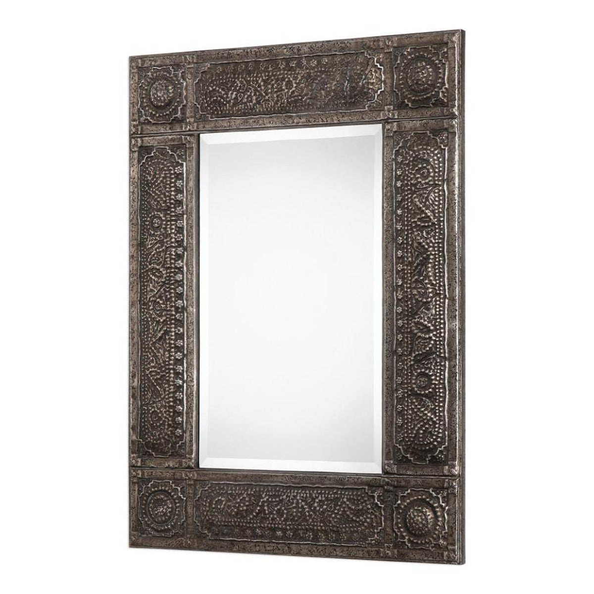 The Keiichi Morrocco Mirror brings old-world charm with a contemporary twist to your space. This beautiful mirror features an embossed metal frame finished in a heavily antiqued rust gray wash with silver undertones and subtle black distressing. The mirror itself boasts a generous 1.25" bevel, adding depth and elegance. Suitable for various rooms, from entryways to living areas and bedrooms, this versatile piece can be hung vertically or horizontally to best suit your space. The intricate detailing of the frame provides visual interest and a touch of vintage appeal while maintaining modern functionality. The Keiichi Morrocco Mirror is crafted to meet the highest standards of quality, reflecting Keiichi's commitment to blending artistry and durability. Whether used as a statement piece or a complementary addition to your décor, this mirror adds sophistication and character, making any space feel more inviting.