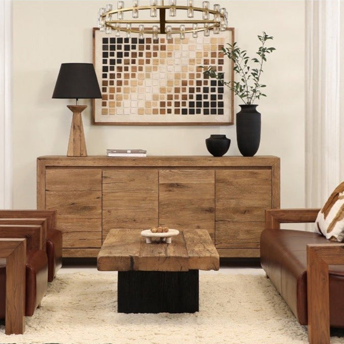 The Keiichi Reclaimed Oak Coffee Table is a piece that combines functionality with timeless style. Made from European oak up to 100 years old, this coffee table brings history and character into your living space. The wood is carefully sourced from old barns and structural buildings across Europe, hand-sorted, de-nailed, and cleaned to highlight its natural splits, cracks, and unique marks. Each piece is finished with a clear wax that enhances the oak’s natural grain, ensuring that no two tables are alike. This coffee table offers a perfect blend of modern and rustic appeal, fitting effortlessly into any interior design, whether traditional or contemporary. The Keiichi collection is synonymous with high-quality craftsmanship, and this coffee table is no exception. Durable and aesthetically pleasing, it serves as a centerpiece in your living room, providing both practical surface space and a touch of heritage.