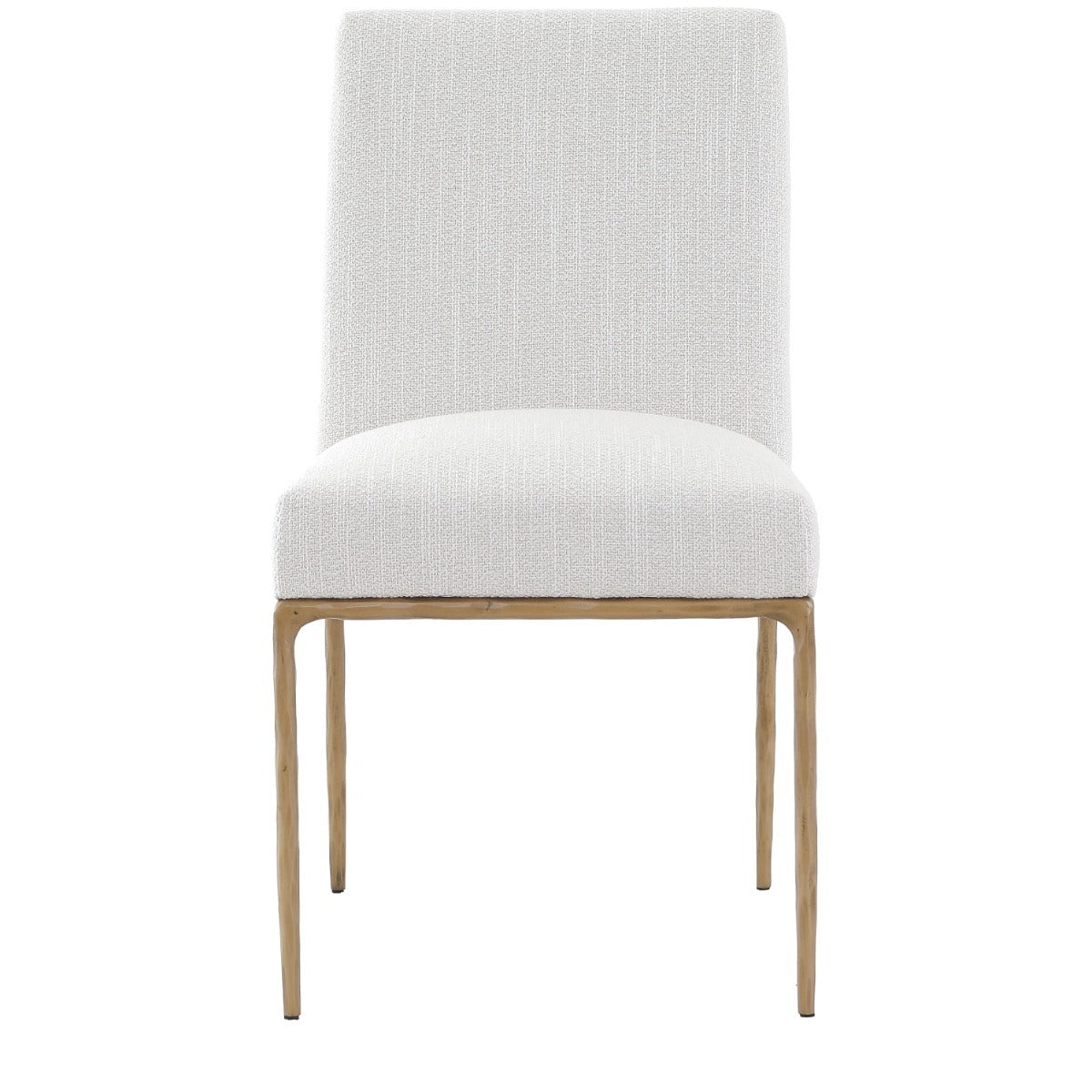 Keiichi Sloane Dining Chair Aged Brass embodies the elegance of mid-century modern design, making it a sophisticated addition to any dining room. This chair features forged metal legs in a luxurious aged brass finish, paired with off-white C0 fabric upholstery for a refined look. The C0 fabric is known for being environmentally friendly, waterproof, and free of PFAS, ensuring that spills roll off instead of absorbing into the material. This innovation in fabric technology provides both peace of mind and long-lasting use. The Sloane Dining Chair's sleek lines and premium materials make it versatile for various décor styles, whether contemporary or traditional. It also pairs seamlessly with other pieces in the Keiichi collection. Designed for comfort and visual appeal, this chair elevates your dining experience with its timeless beauty and functional excellence. A matching version with arms is available for added variety.