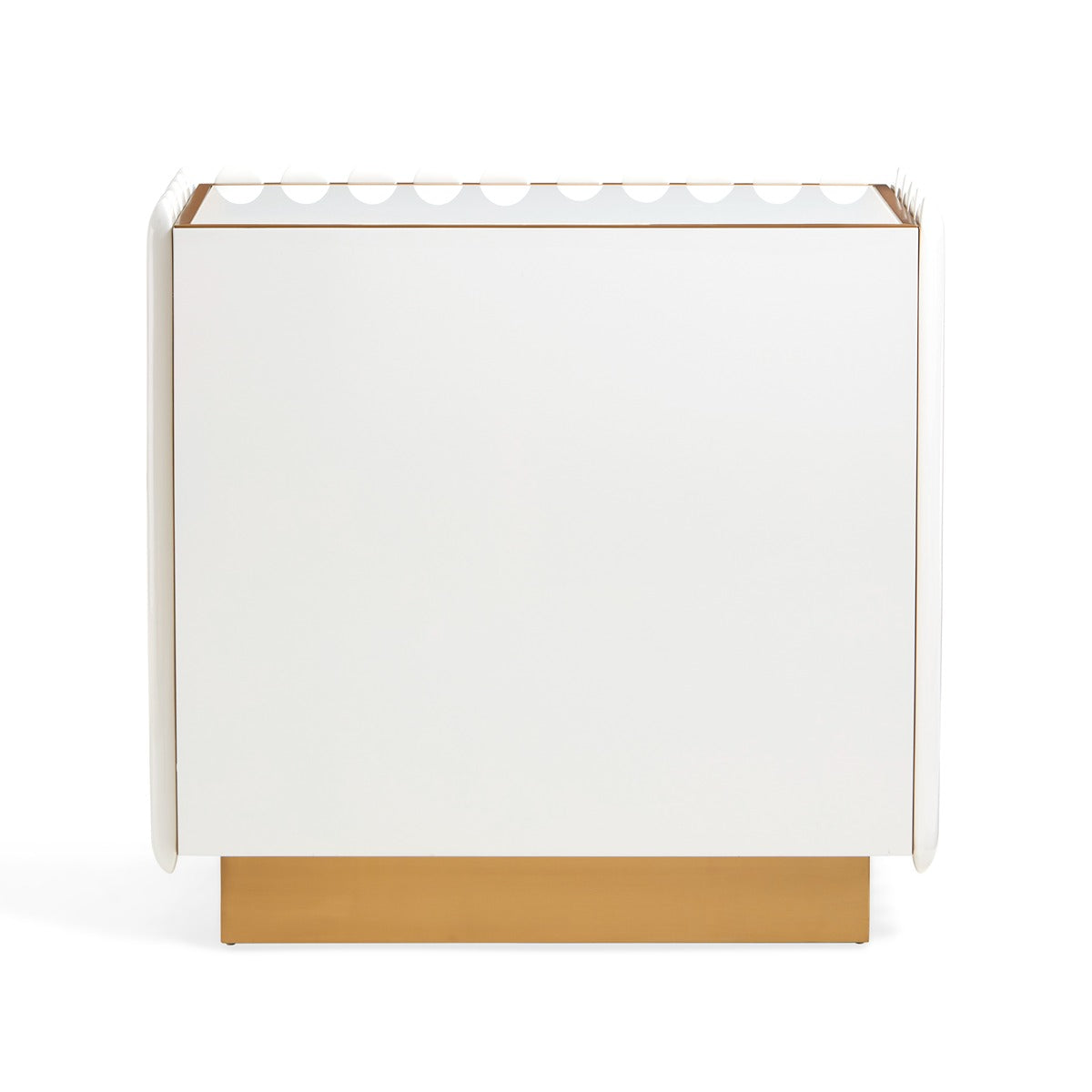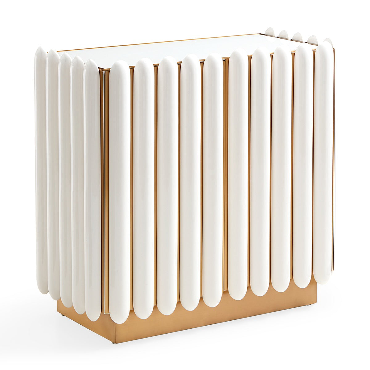 A brushed brass cabinet faced with puffy capsules in glossy deep teal or ivory lacquer with an ivory back painted glass top floating on a recessed base. Its interior is fitted with two velvet-lined, soft-close drawers and an adjustable shelf. Fabulously futuristic and as hardworking as it is glamorous. Two (2) interior felt-lined drawers and one (1) adjustable shelf