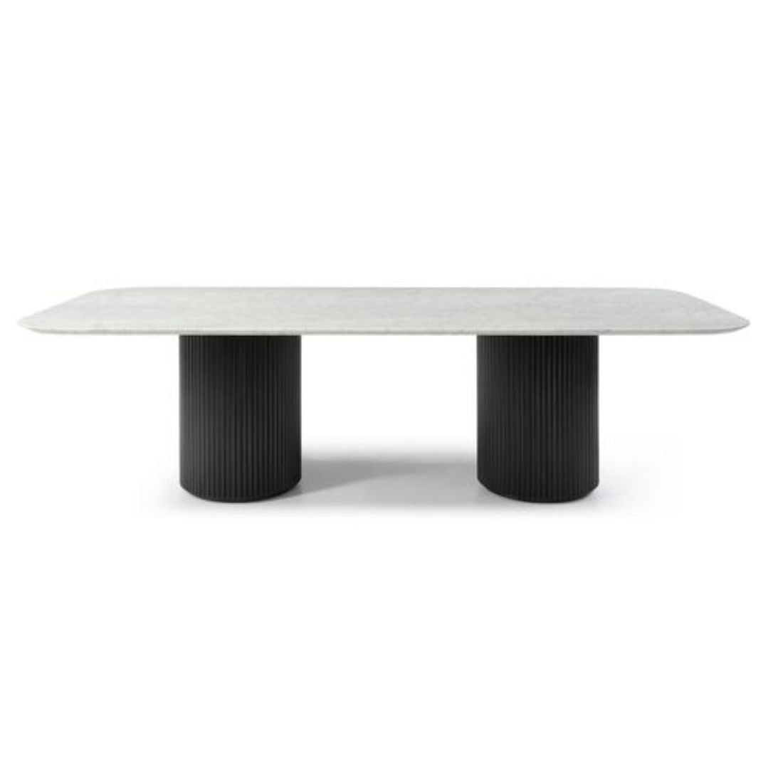 Entertain in style with the Lantine Marble Dining Table, a striking centrepiece that effortlessly blends luxury, contemporary design, and functionality. Its expansive 2.7-metre matte Carrara marble top creates a sense of grandeur, perfect for hosting intimate dinners or lively gatherings with family and friends.The twin pedestal base, finished in matte black with subtle ribbed detailing, adds a sculptural elegance, grounding the table with a modern, architectural edge. Every detail is carefully considered, from the flawless marble surface to the refined, tactile finish of the base, ensuring a table that’s as visually stunning as it is practical. Designed for those who appreciate timeless sophistication, the Lantine Marble Dining Table transforms any dining space into a luxurious, welcoming haven—where style, function, and everyday living converge seamlessly.