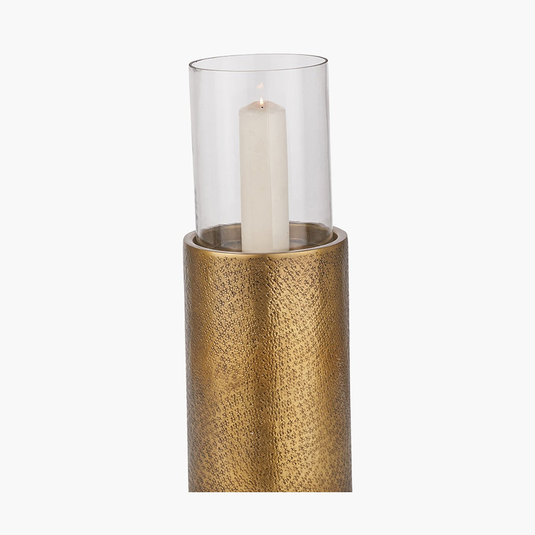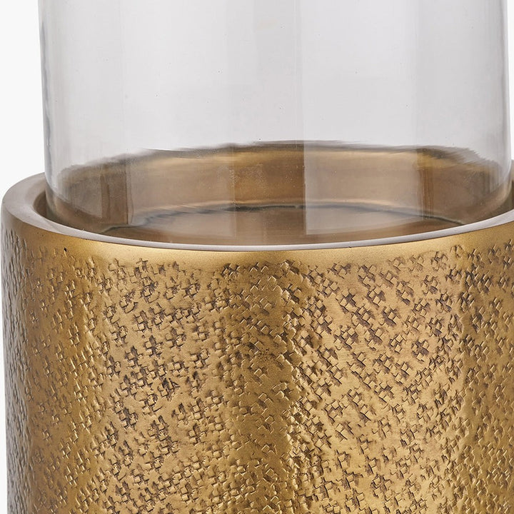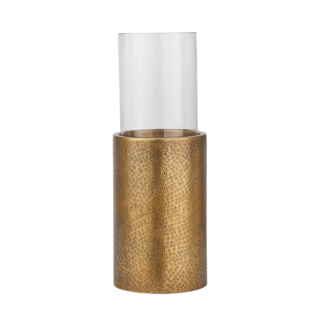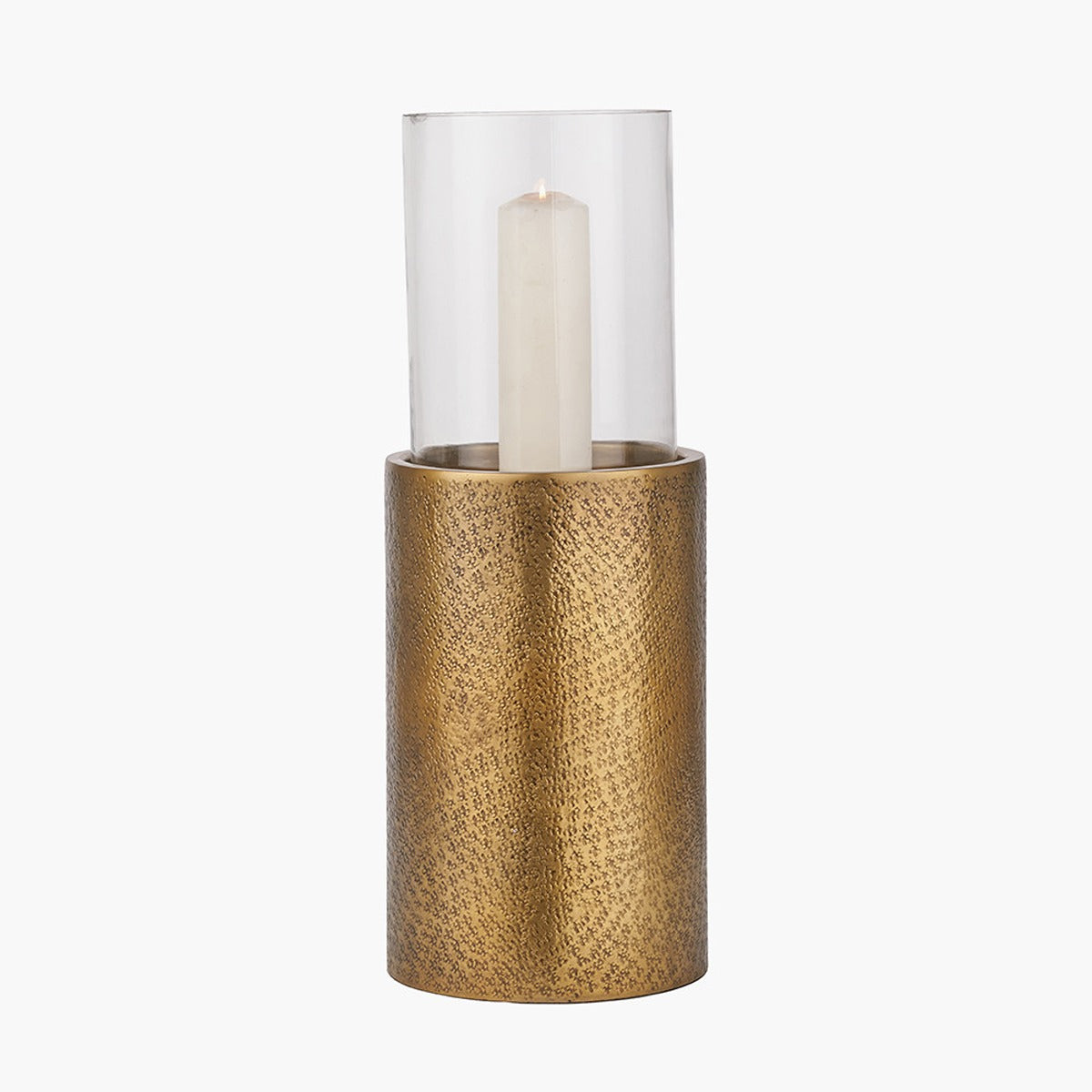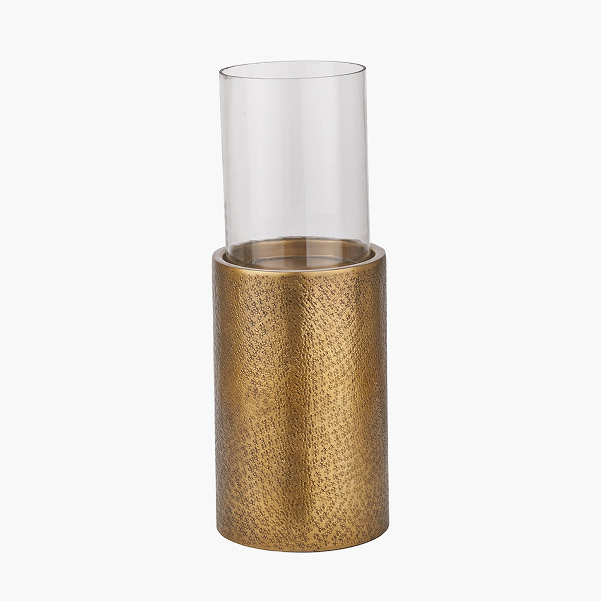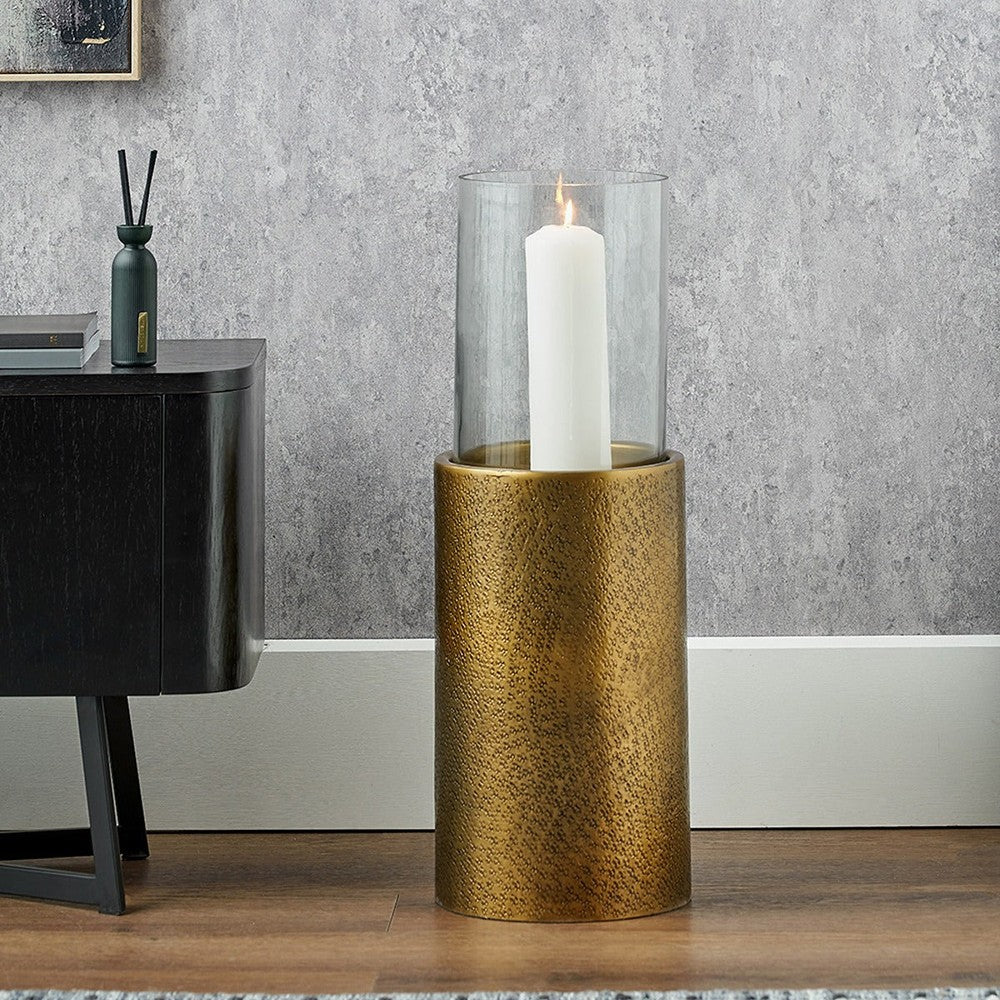 This large metal hurricane, crafted in India, with an antique brass metal finish and glass surround will look fabulous with a large pillar candle, and is guaranteed to make a statement. Add atmosphere and ambience to your home, from your living room to your hallway.