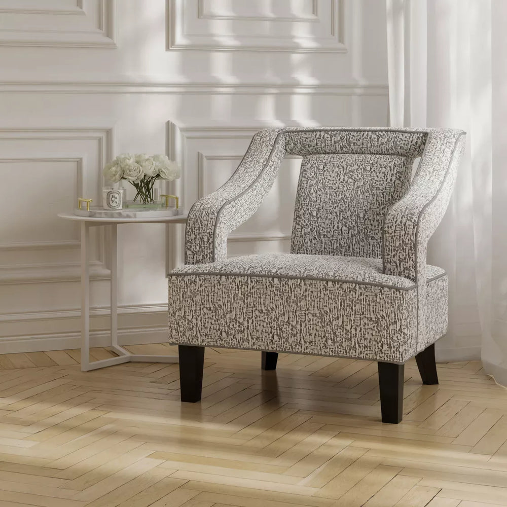 The Larson chair pairs its textured Elephant upholstery with contrast piping in a refined design. Its wide, plush armchair silhouette sits atop sleek matte black legs, blending comfort and sophistication.