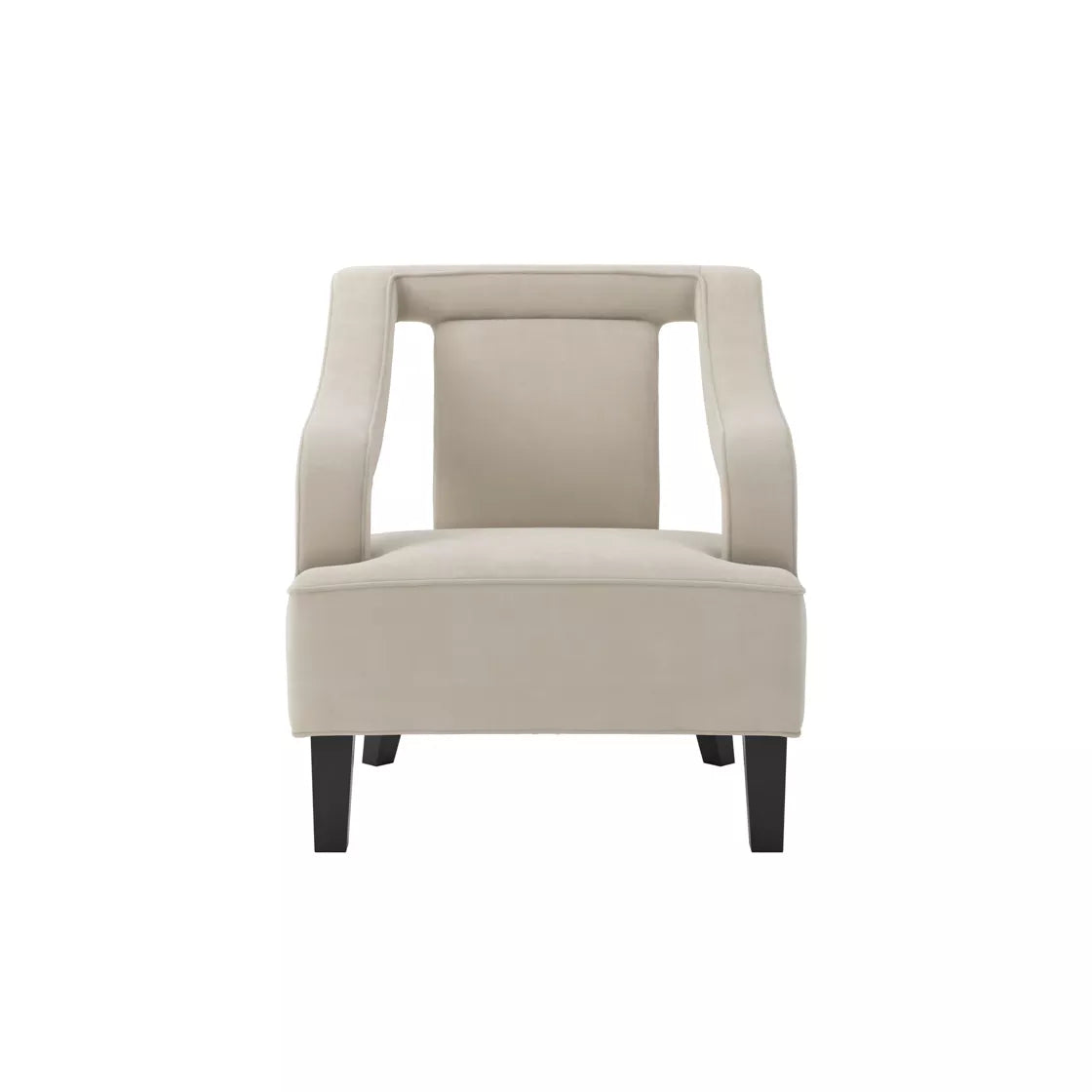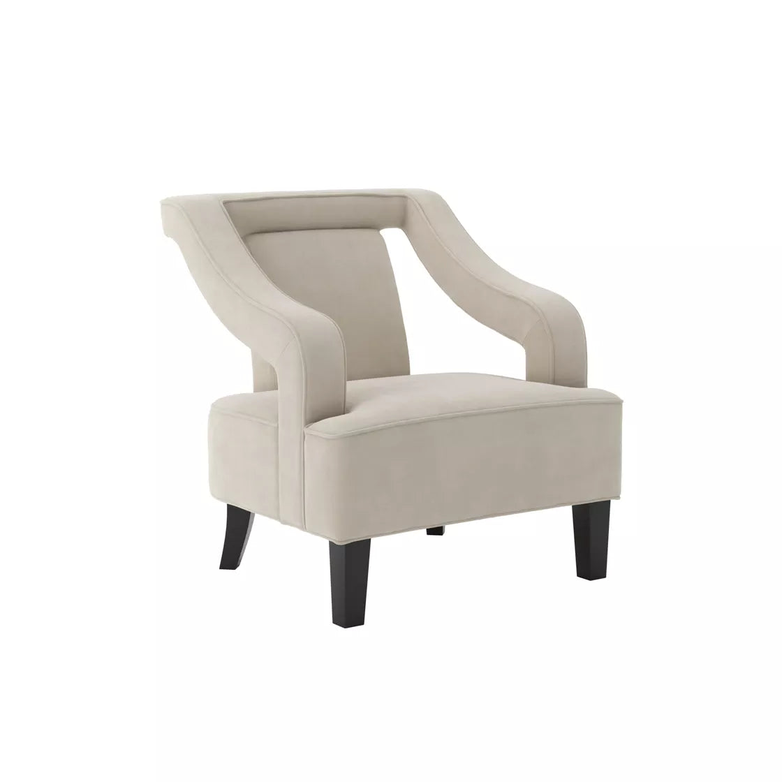 The Larson Chair, upholstered in soft Ivory velvet, features elegant contrast piping and a refined silhouette. Its wide, plush seat offers luxurious comfort, while sleek matte black legs complete the sophisticated design—perfect for modern living spaces.