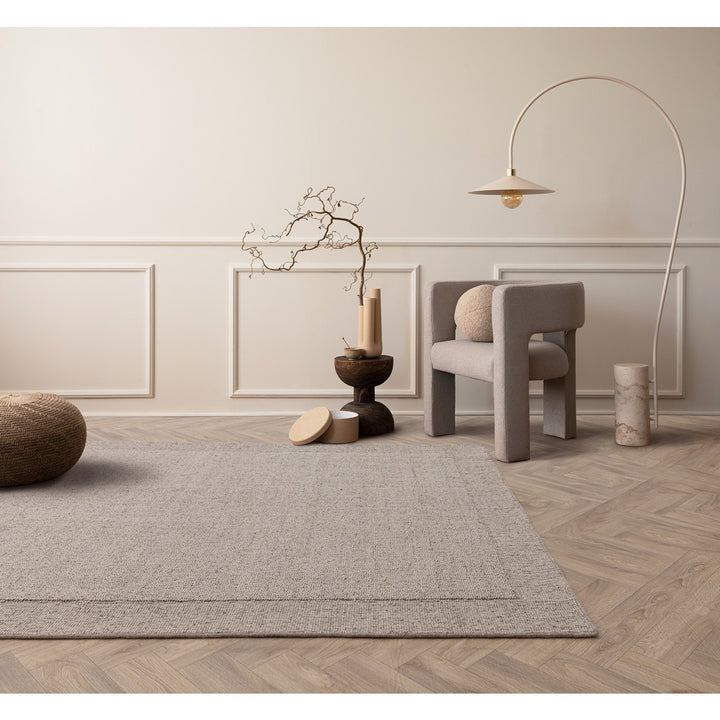 Using natural undyed wool, this rug creates a relaxed distressed aesthetic that effortlessly works is any space. Dyed in warm natural tones with a soft wide edged border for a classic style.
