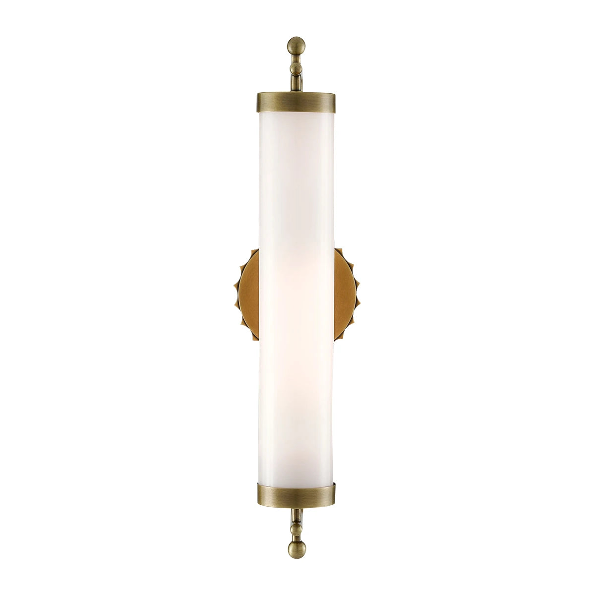 The Latimer Brass Wall Sconce in our Barry Goralnick Collection is made of metal in an antique brass finish and a tubular milk-glass shade. This gold sconce is IP44 rated for bathrooms.