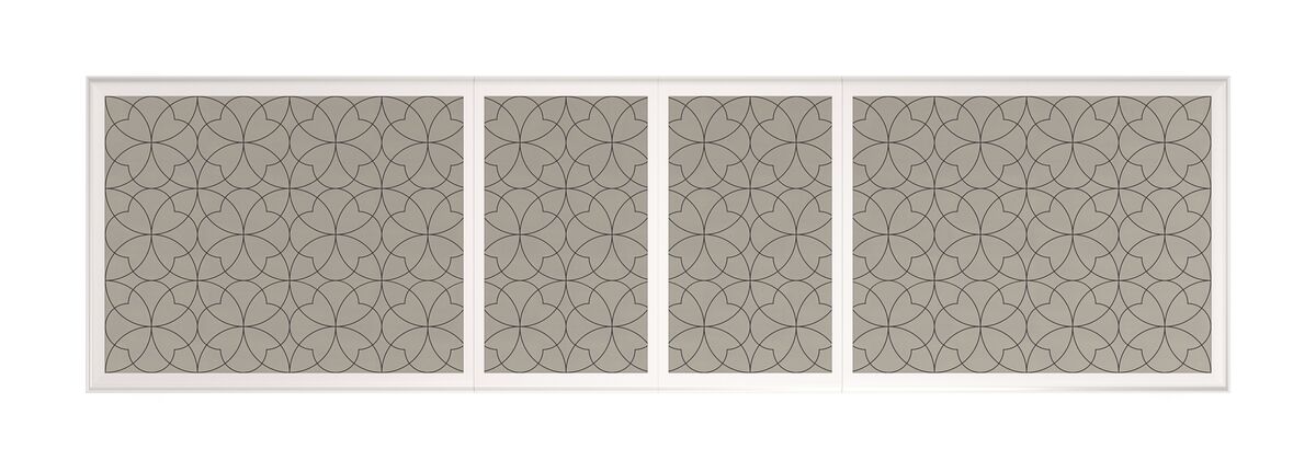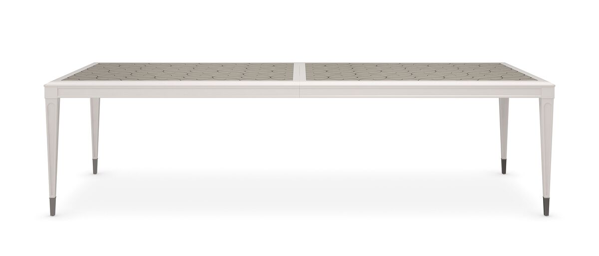 Elevate any occasion with this exquisite glass top dining table, featuring mirrored panels embellished in Soft Silver paint to create a Moroccan-tiled, geometric pattern. A shimmering Stardust finish dramatically defines its solid wood frame with tall, tapered legs capped in Deep Bronze metal ferrules. Accommodates up to 14 guests when fully extended. Top is back-painted mirrored panels in Soft Silver paint. Legs in Stardust. Metal ferrules in Deep Bronze. Table extends to 424 with two 69cm leaves. Table accommodates 14 when fully extended.