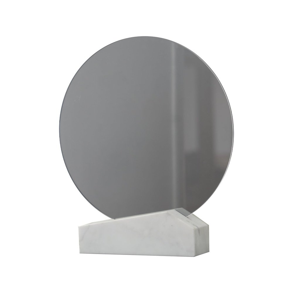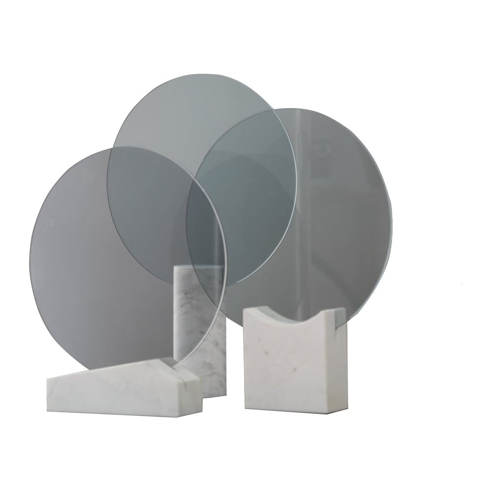 This gorgeous sculpture is simple and striking in appearance and will add the perfect finishing touch to a modern or contemporary home. It features a circular disk of glass plate sitting on a solid marble base.