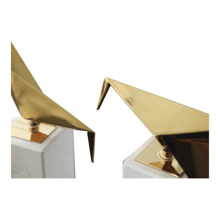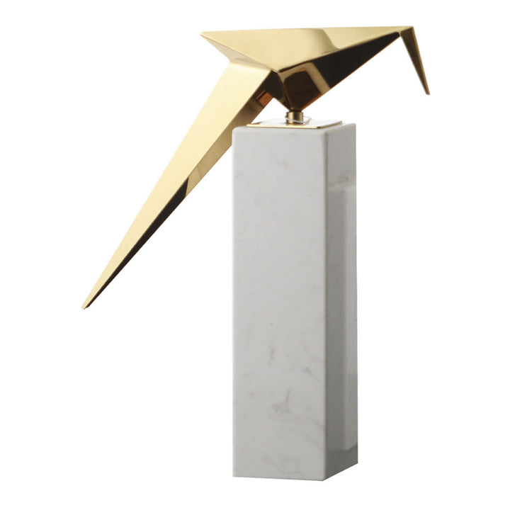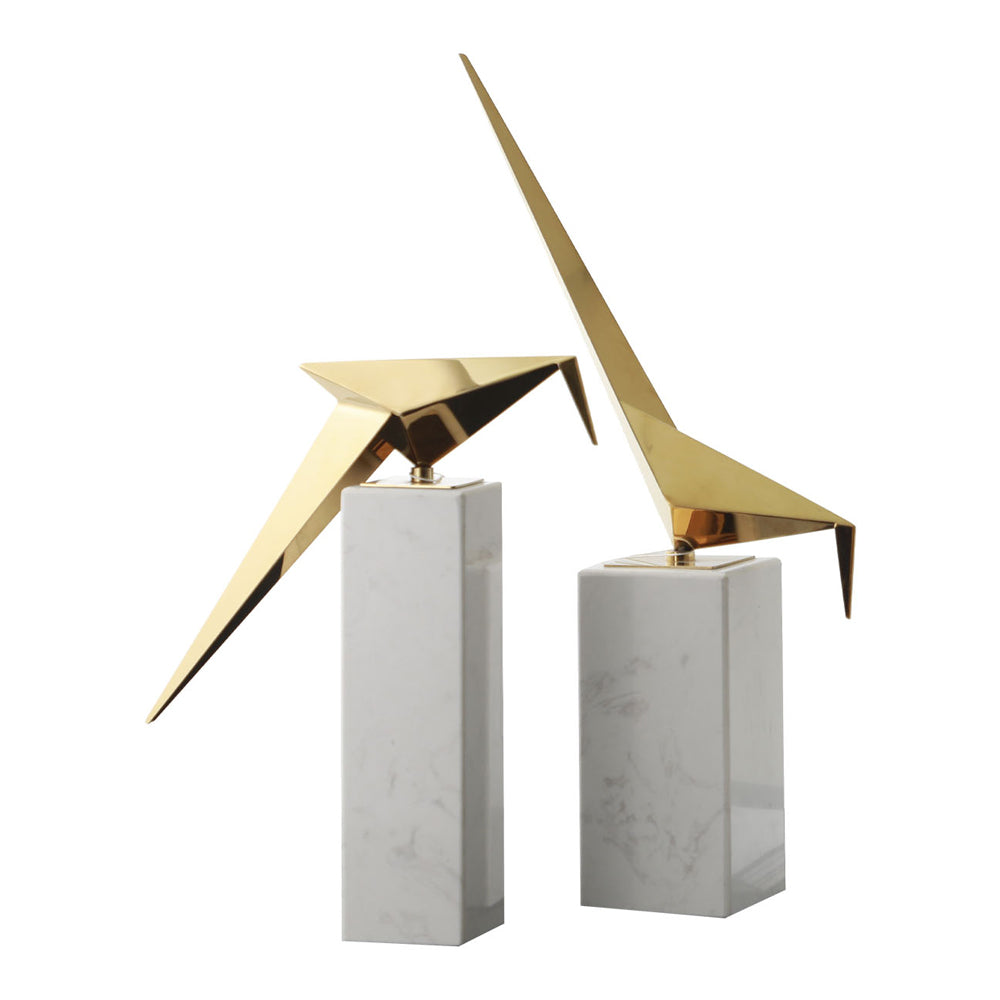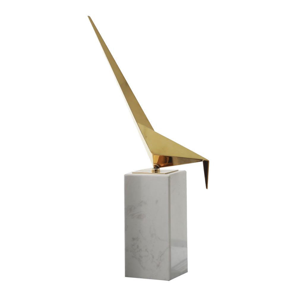 A truly modern piece of art, the Alma Bird sculpture features a sleek geometric bird design with sharp, straight lines. This is finished in an elegant polished brass effect. The bird stands on top of a solid white marble stand, which enhances the opulence of the piece.