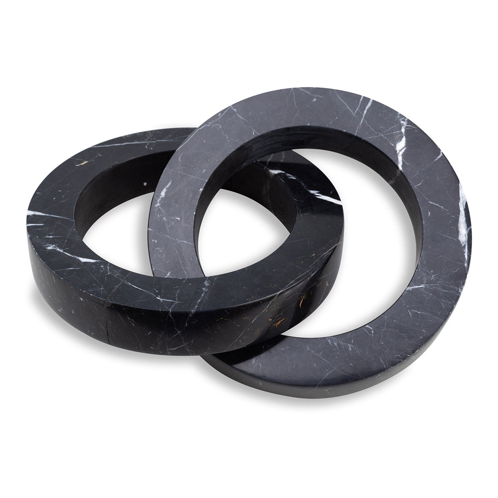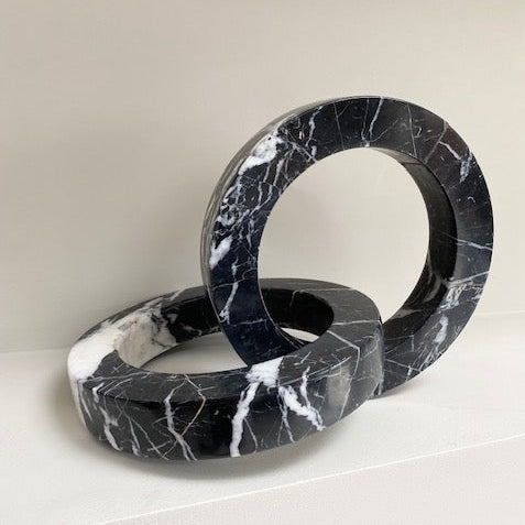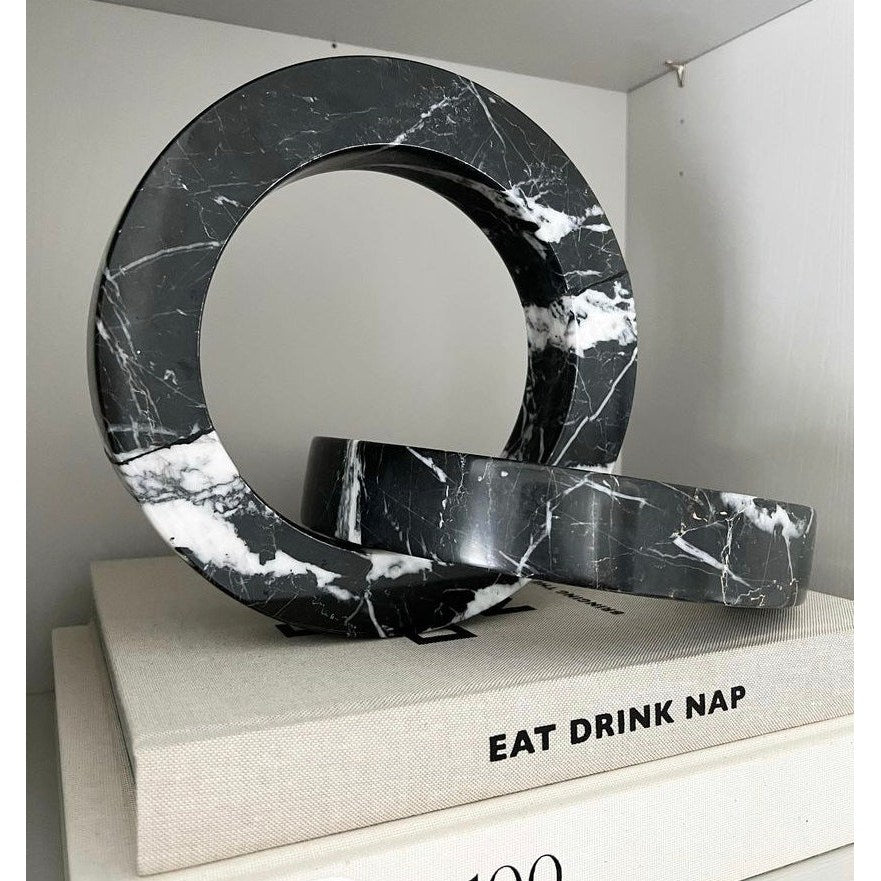 A true statement item, this abstract art-styled ornament is produced from circles of individually and uniquely patterned black marble with naturally occurring veins of white throughout.