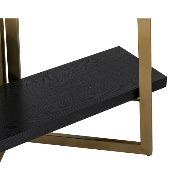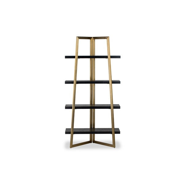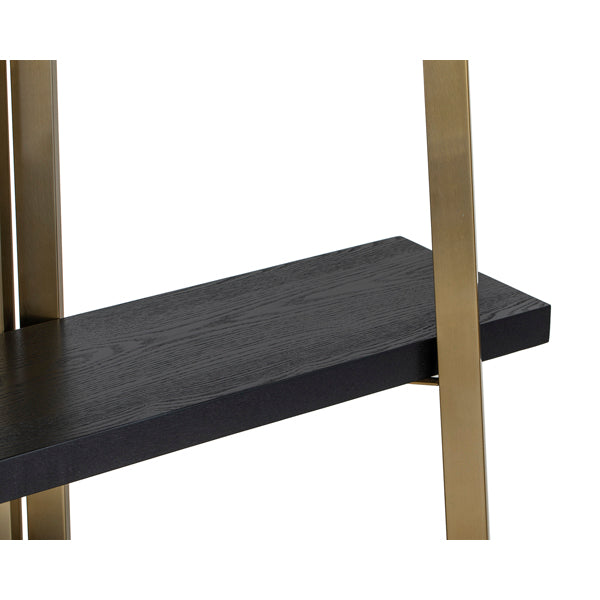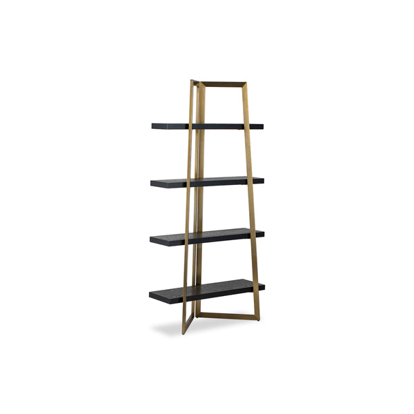 This gorgeous black shelving unit offers a wonderful contrast between the five wooden shelves that have been finished in black and the gold-coloured brushed brass framing.