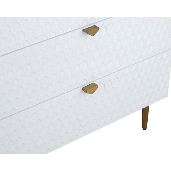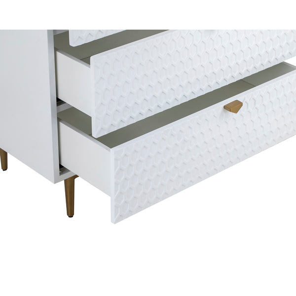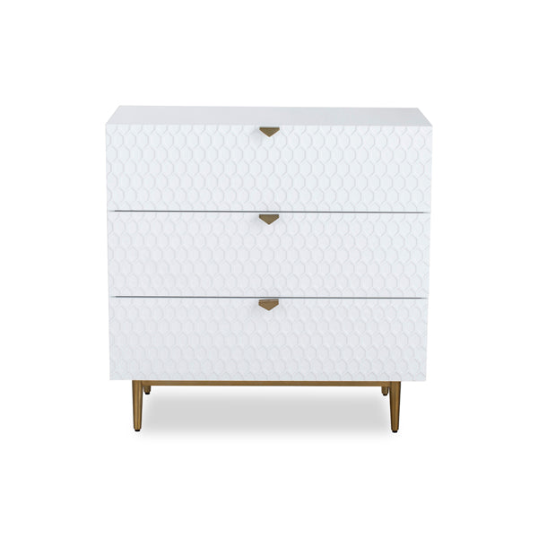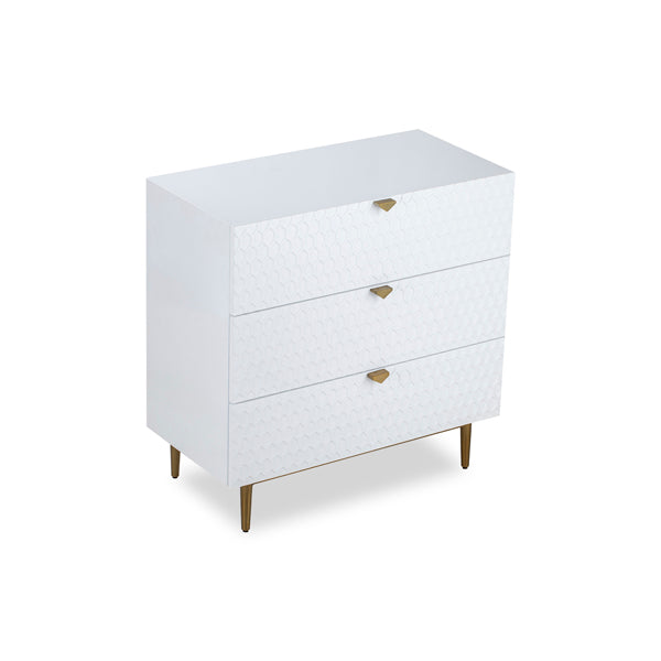 High Gloss White Lacquer with stainless steel brushed golden base and handles. Modern luxury cleverly defines the Bolero Chest of Drawers. This chest of drawers ensures that you are making a long-lasting addition to your interiors. The eye-catching hexagon pattern is further emphasised by a 3D effect. Three drawers offer plenty of storage space for the essentials of your choice.