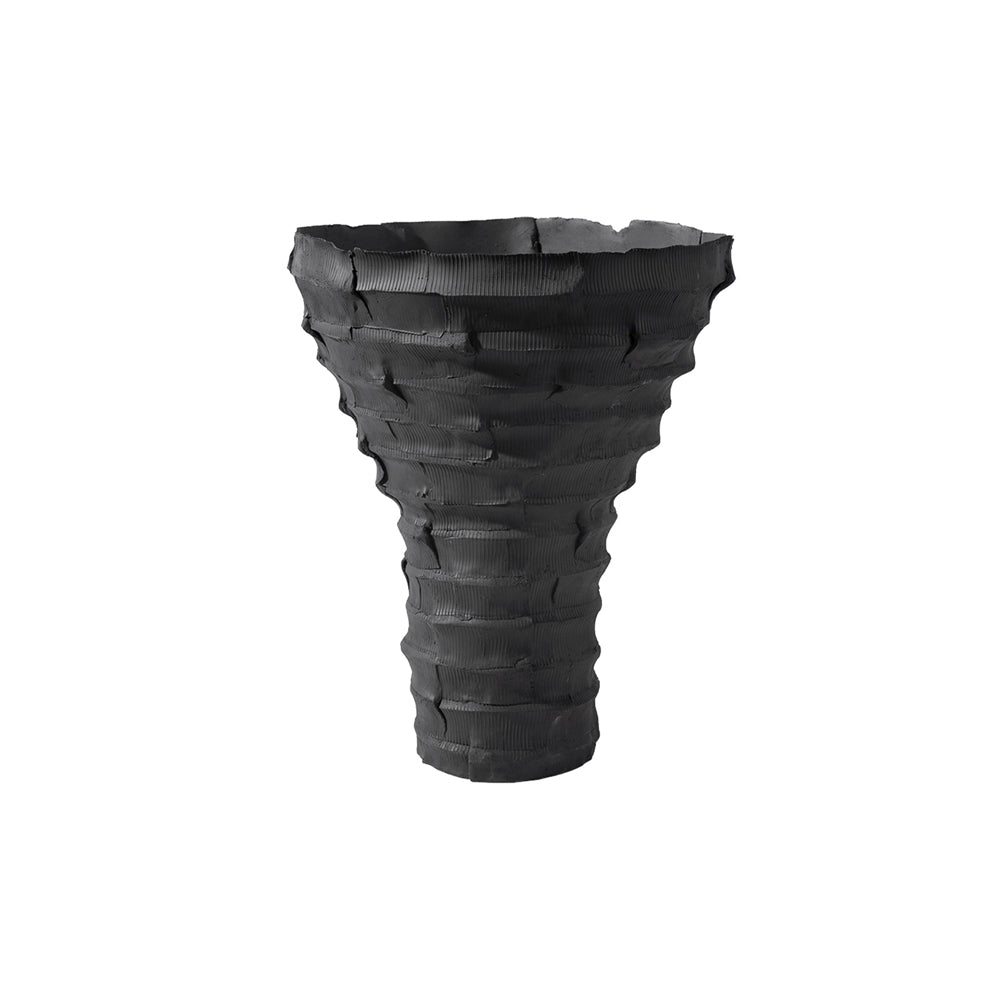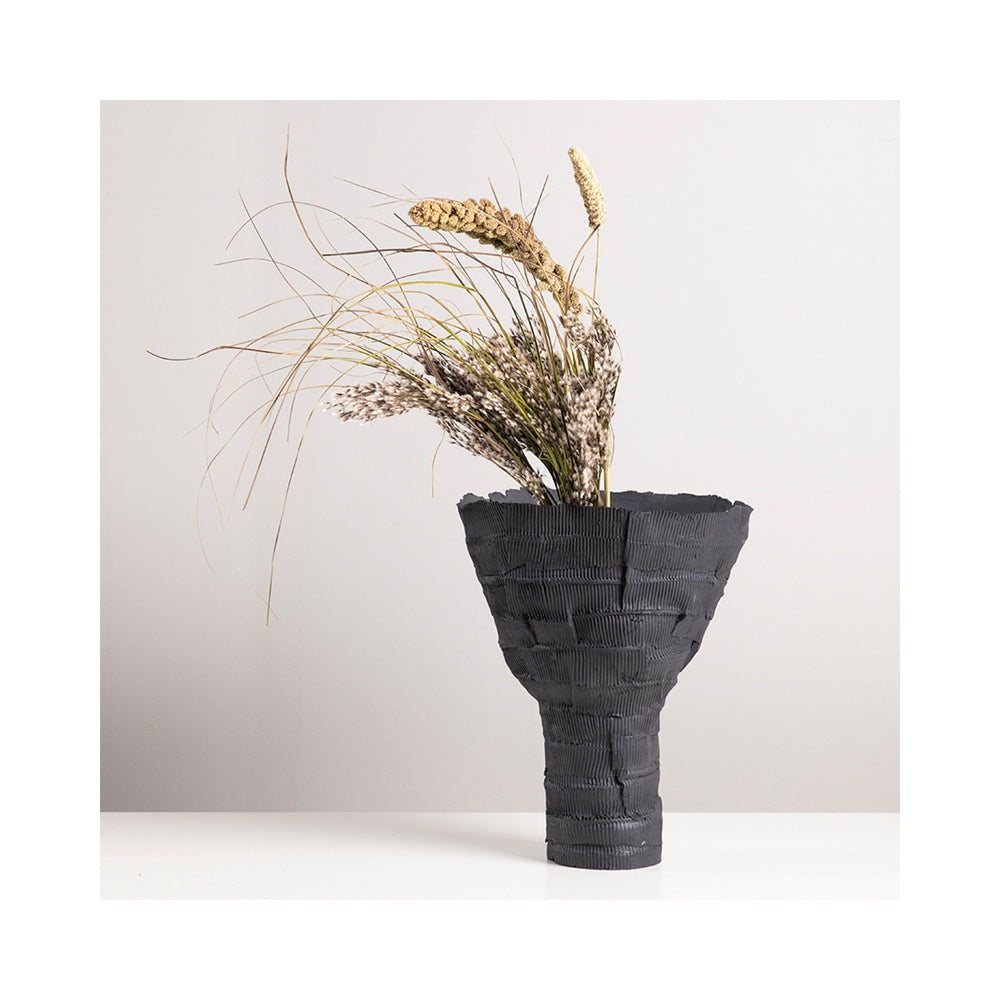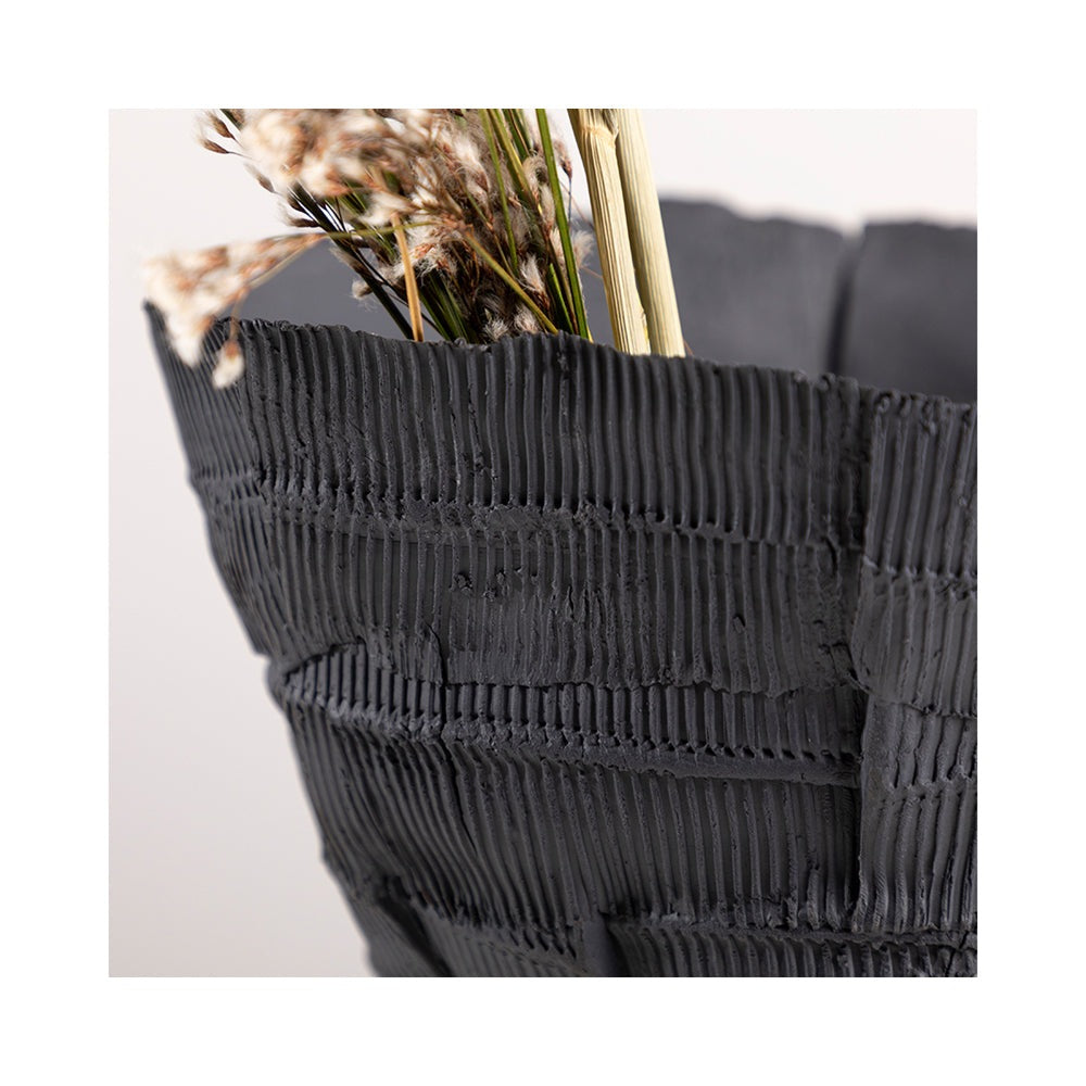 Get a stylish look for your home with this unusual Dione black vase from Liang and Eimil. The vase is made from ceramic but has a textured finish to give it a tactile quality. It has a cylindrical base that opens out, keeping the stems of your flowers snug while letting the blooms fan out.