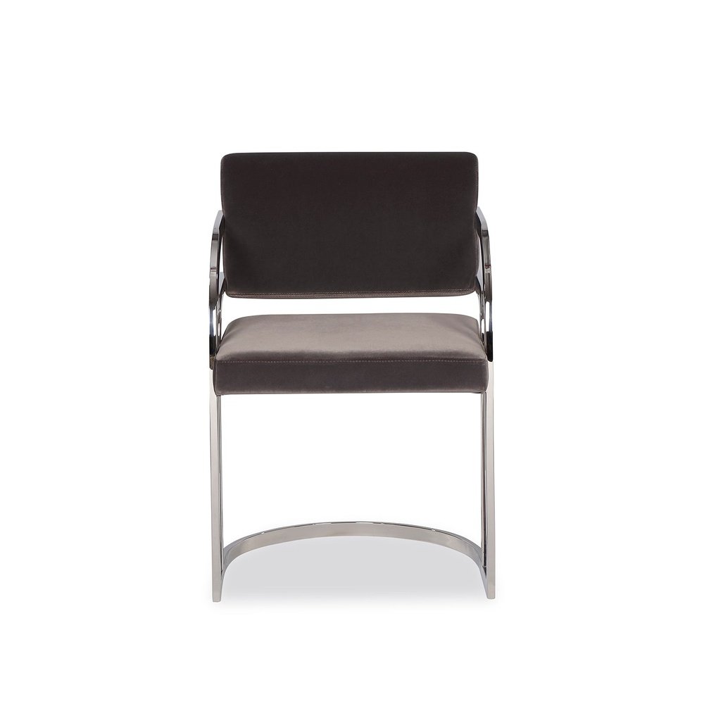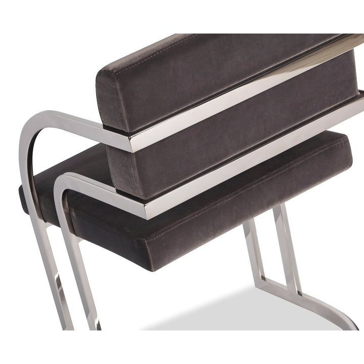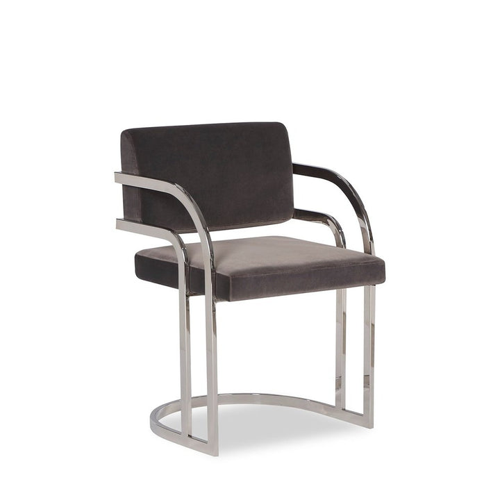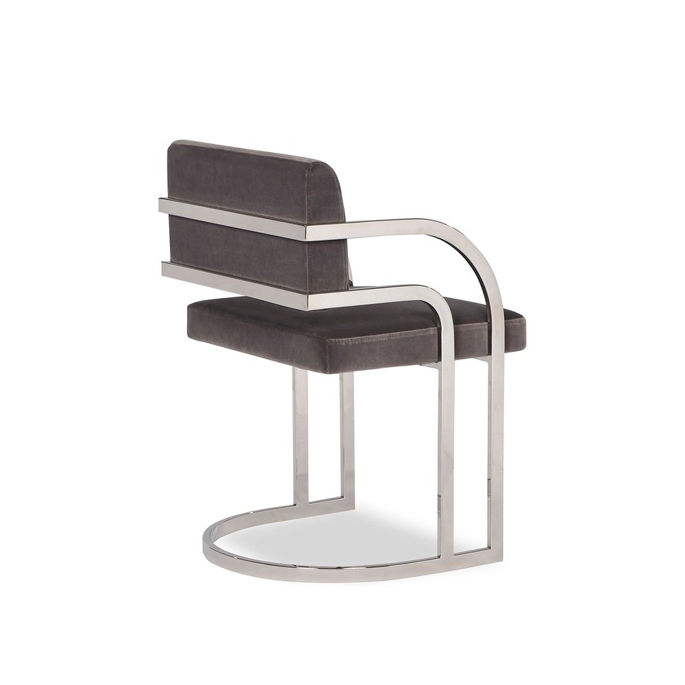 Boasting a sleek metal frame, the Dylan Dining Chair will accentuate your dining room in the most gracious manner. Upholstered in a luxurious Gainsborough Nickel Grey Velvet and finished with polished stainless steel legs, the Dylan will provide ultimate comfort with its deep padded cushions for your guests.
