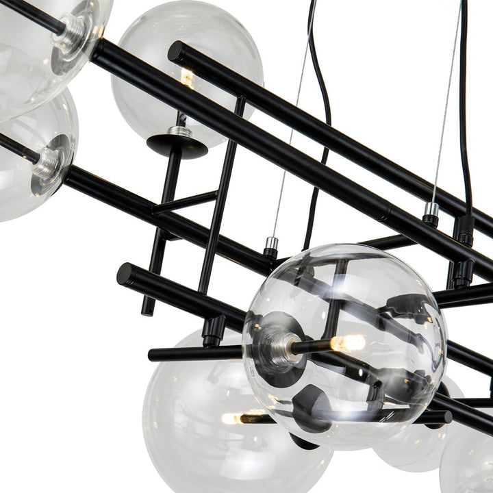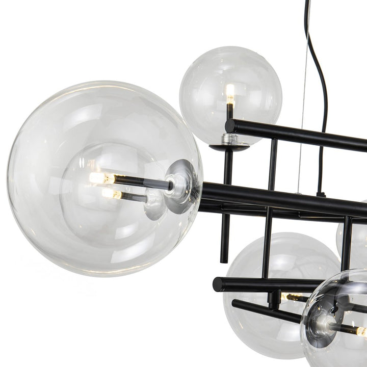 Make a statement with the Icardi Pendant Lamp ? a beautiful piece for enhancing a dining room. A playful design makes the Icardi Pendant Lamp the perfect choice for homes looking for something unique. The blackened metal beams are streamlined and elegant whilst hand-blown glass spheres gather like ethereal balloons around it.