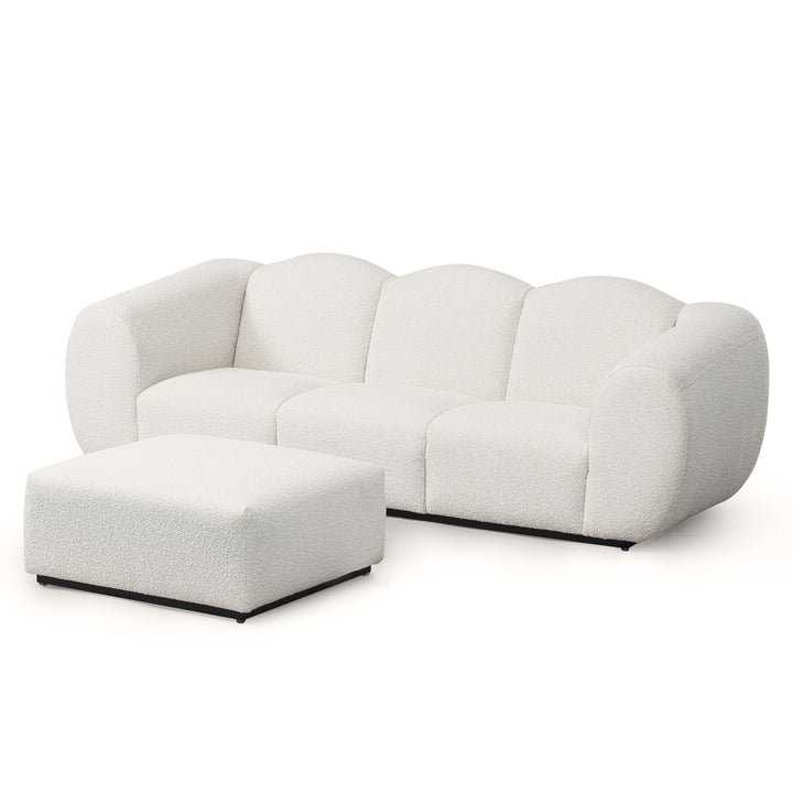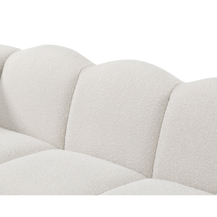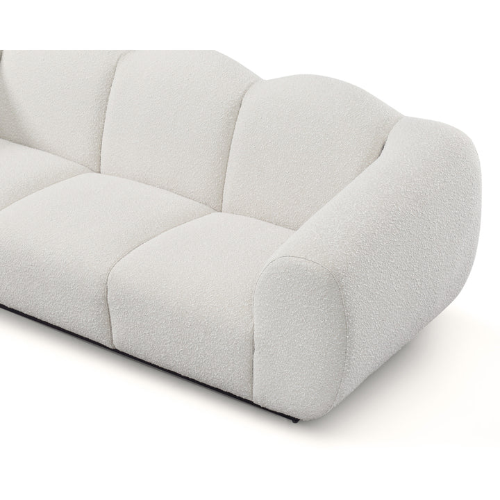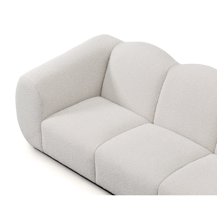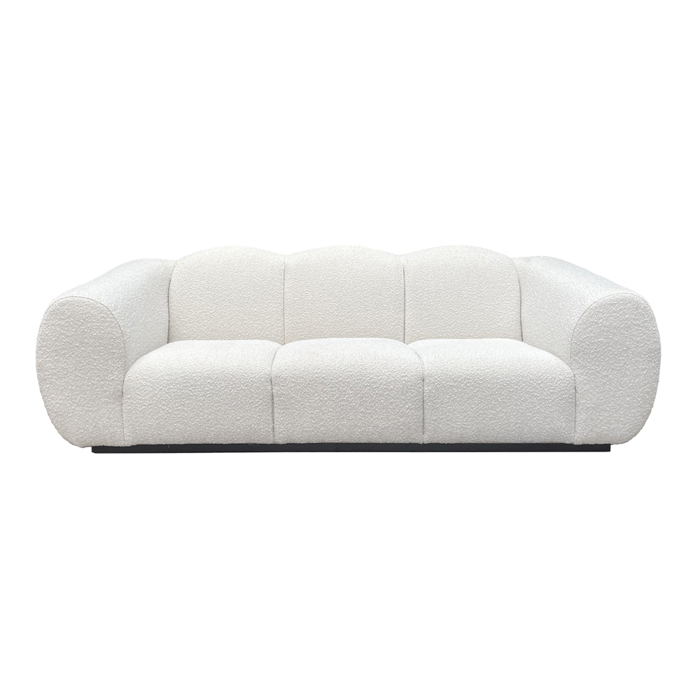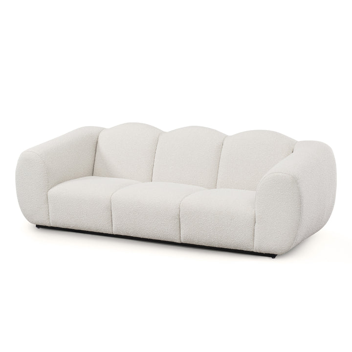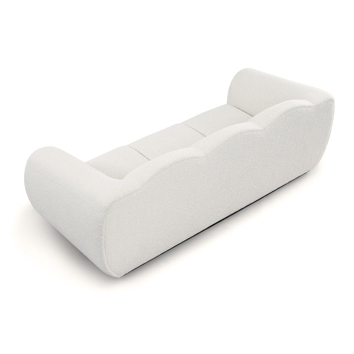 Modernized and bold Art Deco styling is a key feature of the Kendal sofa. Defined by a stylish enveloping silhouette, this glamorous design is bold and curvy with an unmistakable presence, whilst inviting luxe comfort thanks to the tactile finish of the textured and tactile Boucle fabric. The Matt Black Metal Base adds a subtle floating vibe -giving a little air of lightness to the broad hand upholstered channels and oversize Parisian Deco arms.