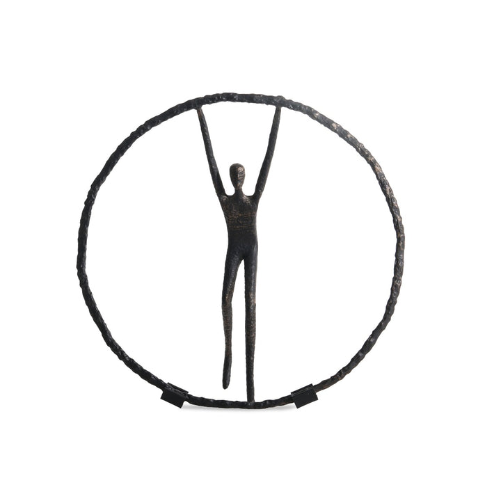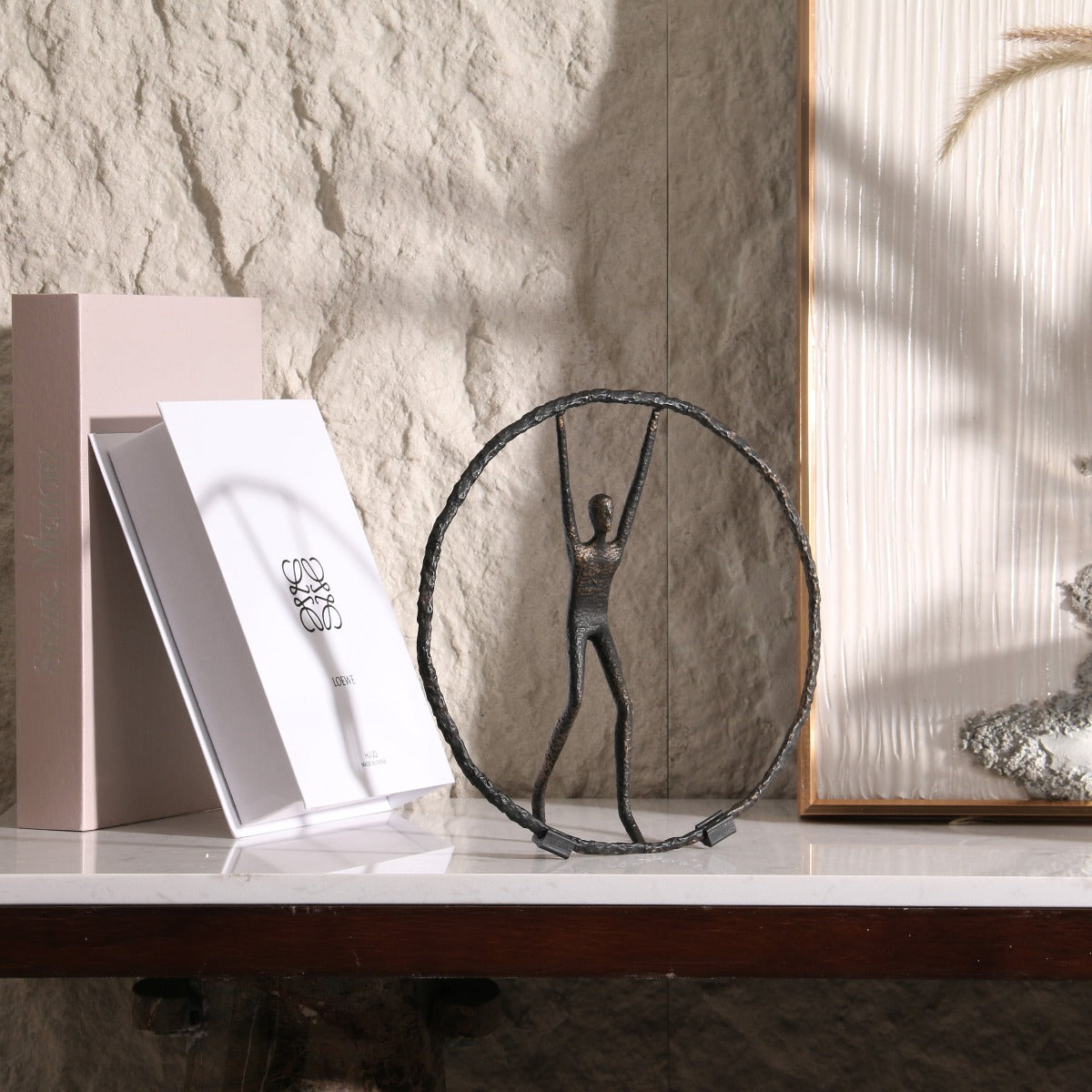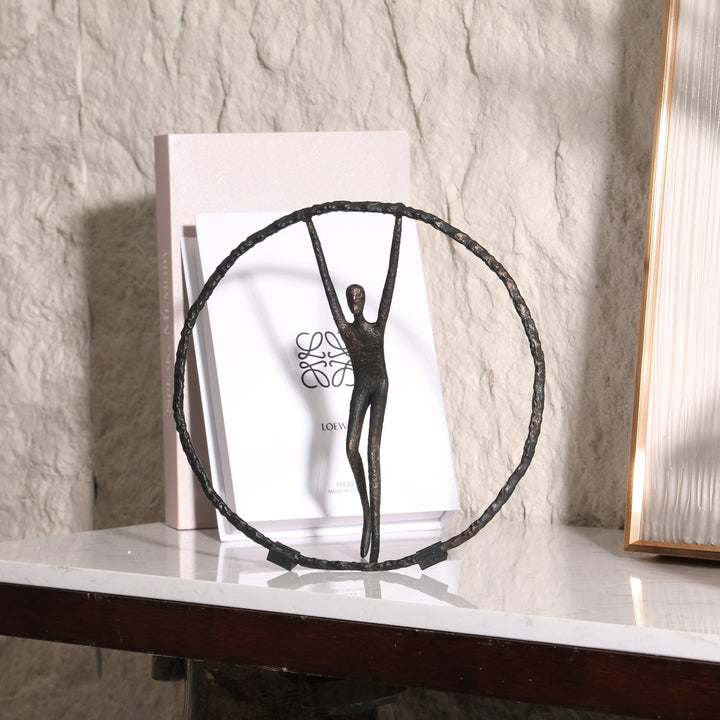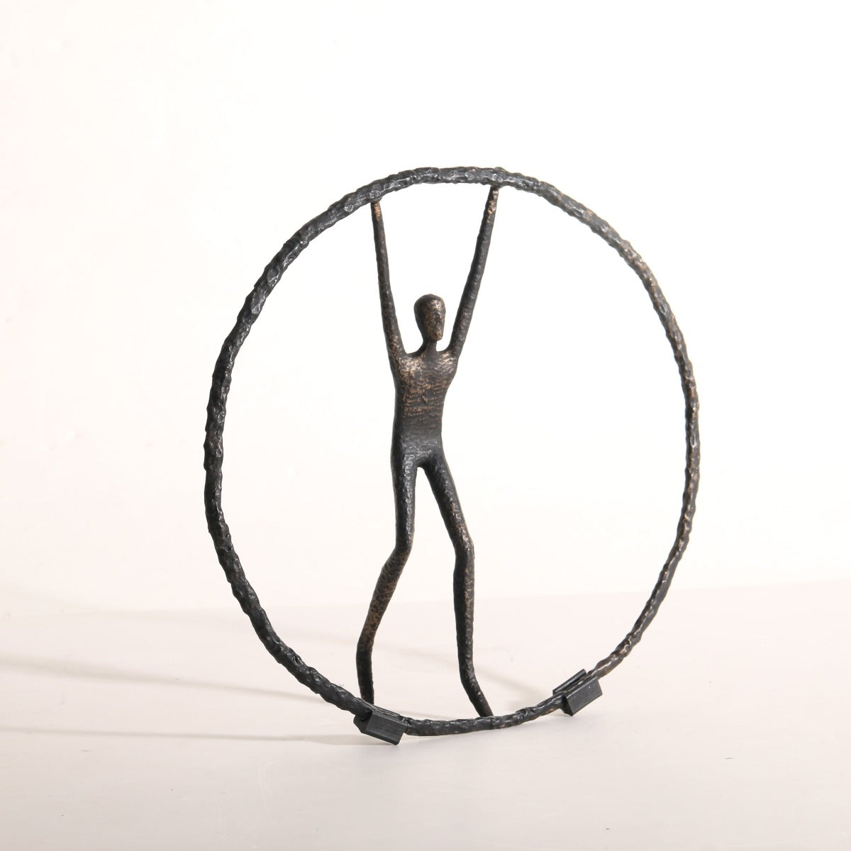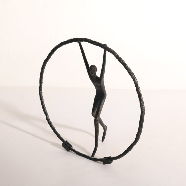 Captivating yet understated, Riley, a black zinc alloy sculpture, commands attention with its geometric abstract design. Its simple yet mesmerising circle, with a person gracefully balancing atop, exudes a playful sophistication. This unique piece, suited for both residential and hospitality settings, adds a touch of intrigue to any living room lounge or study.