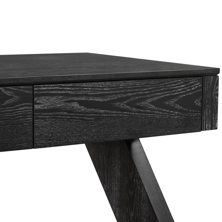 The Zeta Desk exudes a timeless allure with its striking ebony matt black ash veneer finished with cerusing wax to accentuate the wood grain. This meticulous craftsmanship not only enhances the desk's visual appeal but also ensures its durability and resilience. The unique cerused finish adds depth to the wood's natural grain, creating a captivating play of textures that's sure to draw admiring glances.