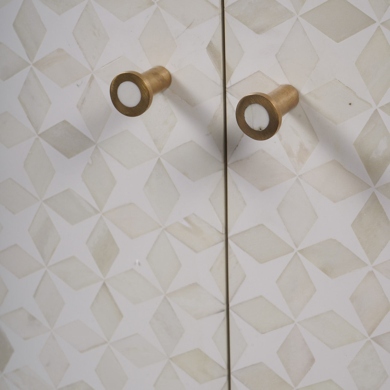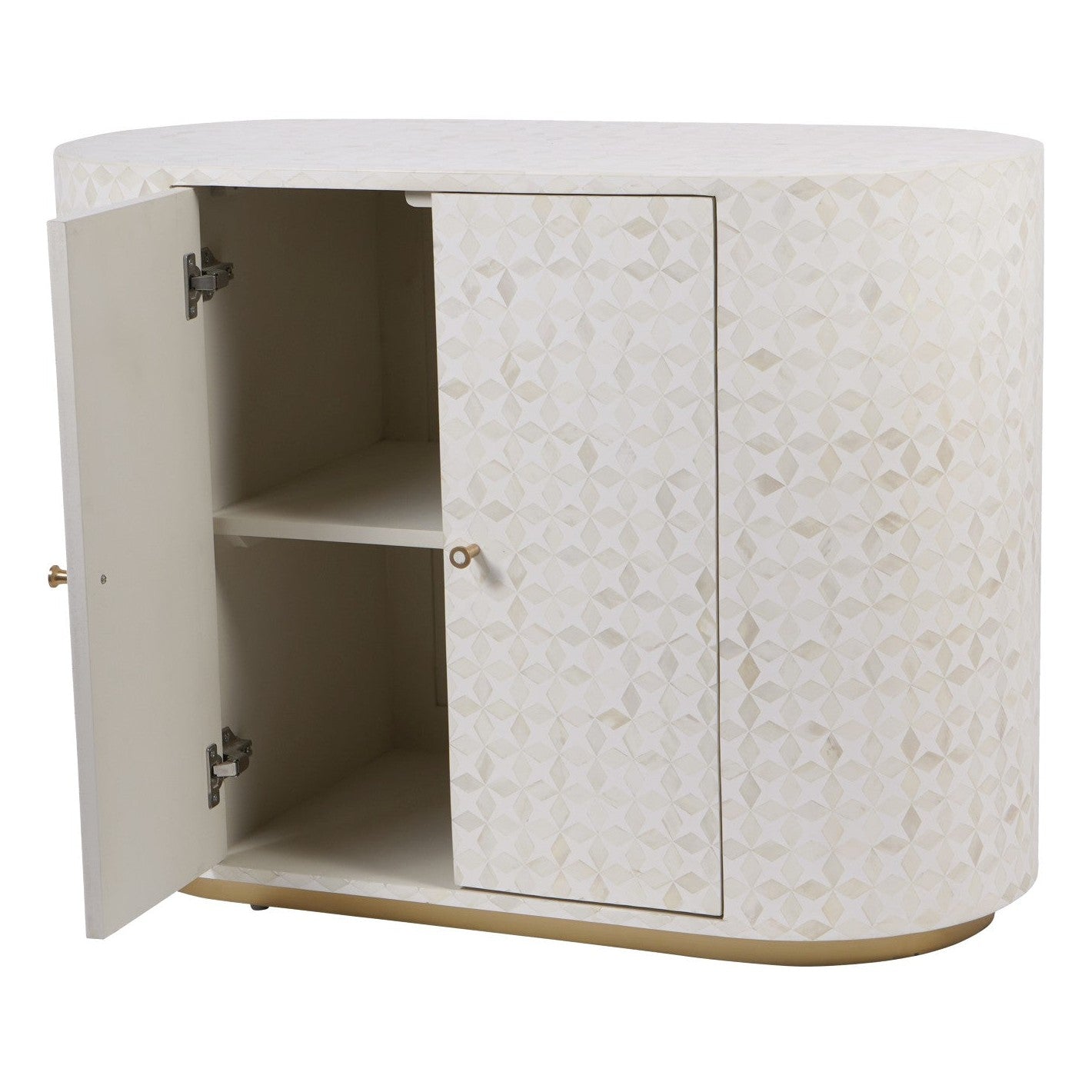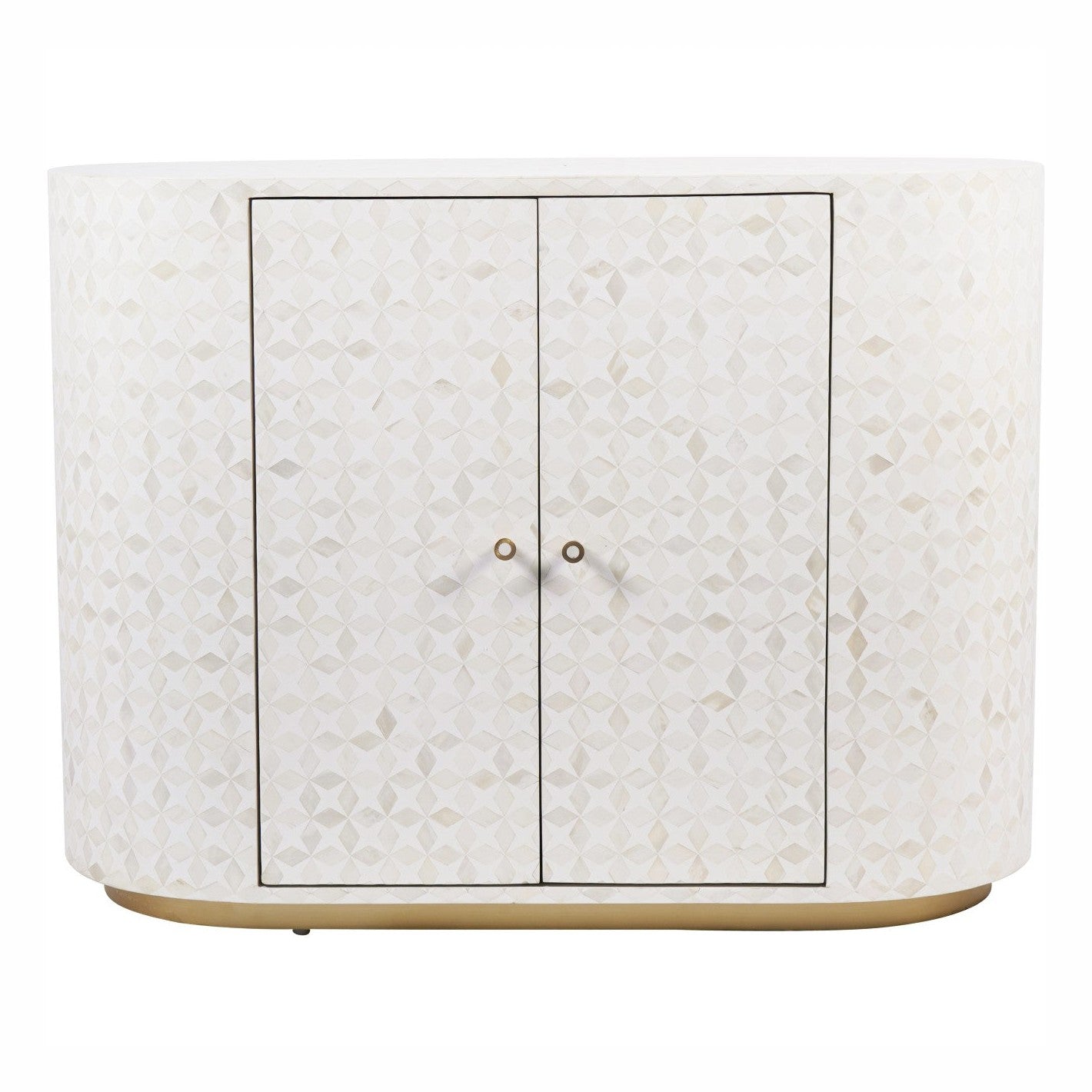 The Aspen Bone Inlay Two-Door Bar Cabinet is a striking cabinet that commands attention with its elegant curved edges. The two doors are beautifully encased in a stunning bone inlay design. Resting on a subtle antique brass plinth, this cabinet offers a refined yet practical storage solution. The piece seamlessly blends timeless artistry with modern functionality, making it a standout addition to any interior. As part of the Aspen collection, it pairs perfectly with the Aspen Bone Inlay Sideboard and Round Mirror, creating a cohesive and breathtaking collection.