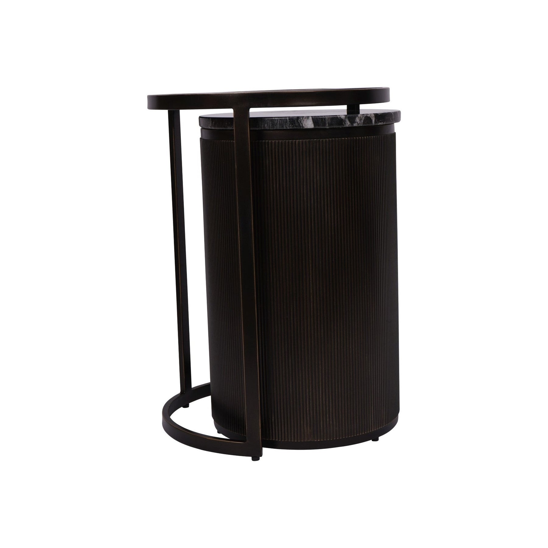 The Belvedere Aged Black Side Table is the ultimate in contemporary, space-saving design. This beautiful side table set features smooth gilded dark bronze frames, black tinted glass, and beautiful Markino Marble. The natural materials used ensure that each piece is unique and gold is used in highlights to contrast against the black tones. Marble tops will feature individual veining patterns and varied colour hues, while the iron bases may have slight texture variations. These characteristics enhance the charm and individuality of your furniture, guaranteeing that no two products are exactly alike. The Belvedere Aged Black range also includes a side table and a console. Additionally, a larger collection is available in Aged Gold.