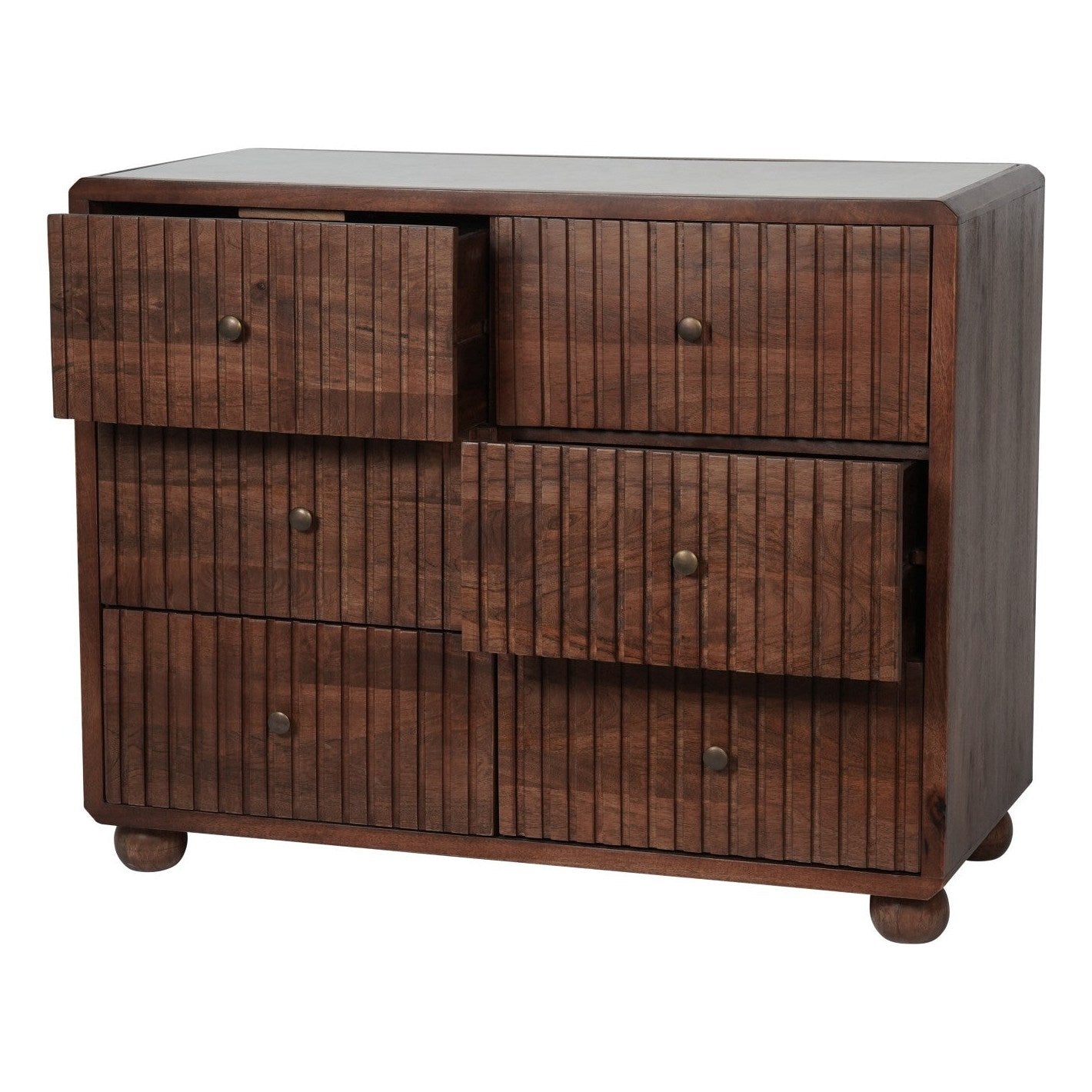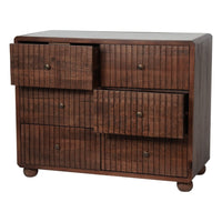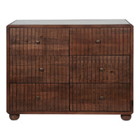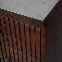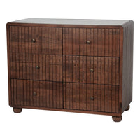 The Carmel Six Drawer Chest is a beautifully crafted and elegant piece of cabinet. It features intricately carved ridged lines with soft, rounded contours, designed to bring timeless style to any room. The chest includes six evenly spaced drawers, in three over three format, creating a balanced and symmetrical design. Crafted from solid mango wood, the chest is topped with an inset layer of luxurious marble in an off-white colour. Small complimentary brass knobs enhance the Art Deco inspired aesthetic. This chest of drawers offers ample storage while seamlessly combining practicality with style. Our Carmel collection includes bedside, 6 drawer chest and mirrors.