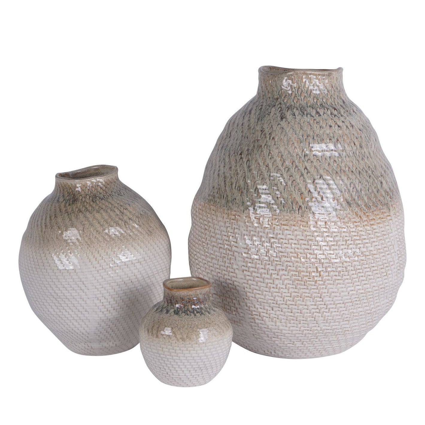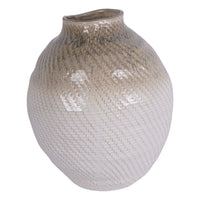 Discover timeless elegance with our Ceramic Woven Vase, a masterpiece of craftsmanship. Inspired by woven baskets, this vase features a mesmerising reactive glaze that accentuates its contours. Its surface showcases subtle variations, enhancing its organic shape and texture. With a palette of white, grey, and taupe, it seamlessly blends into any room. Available in three sizes.