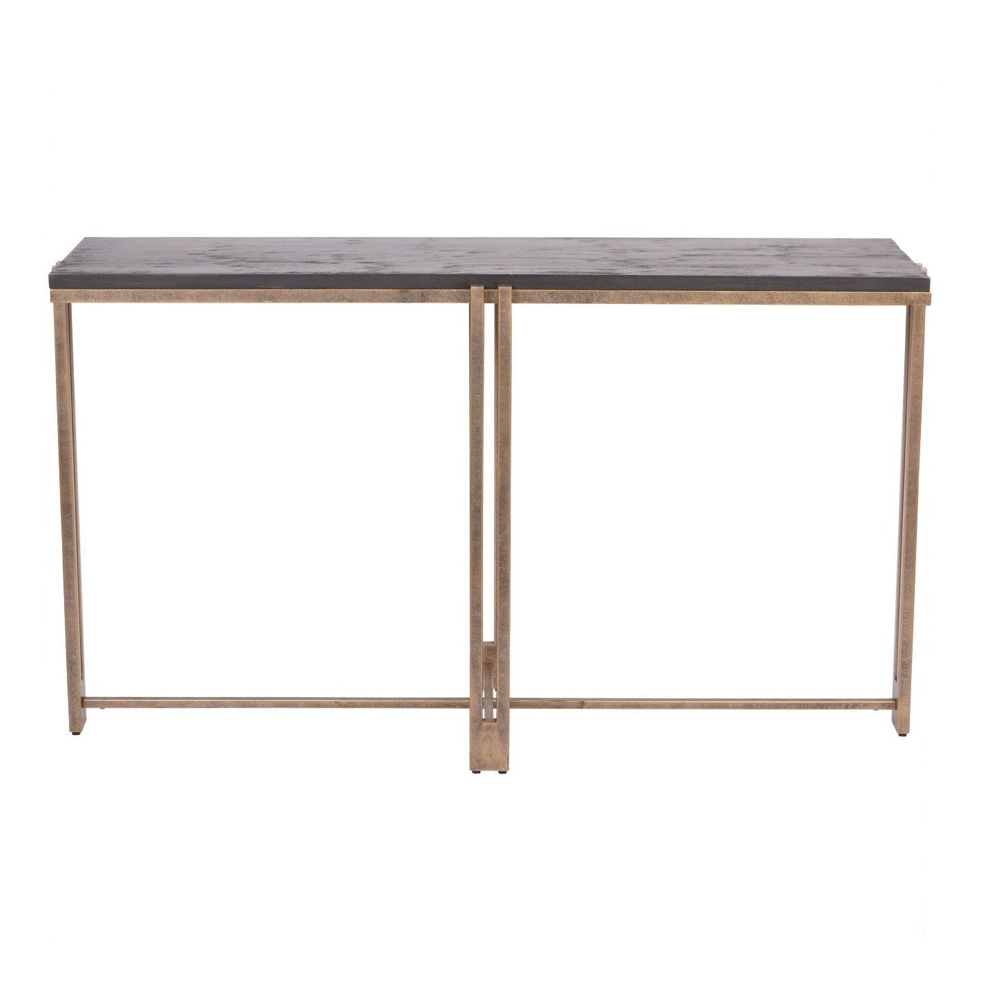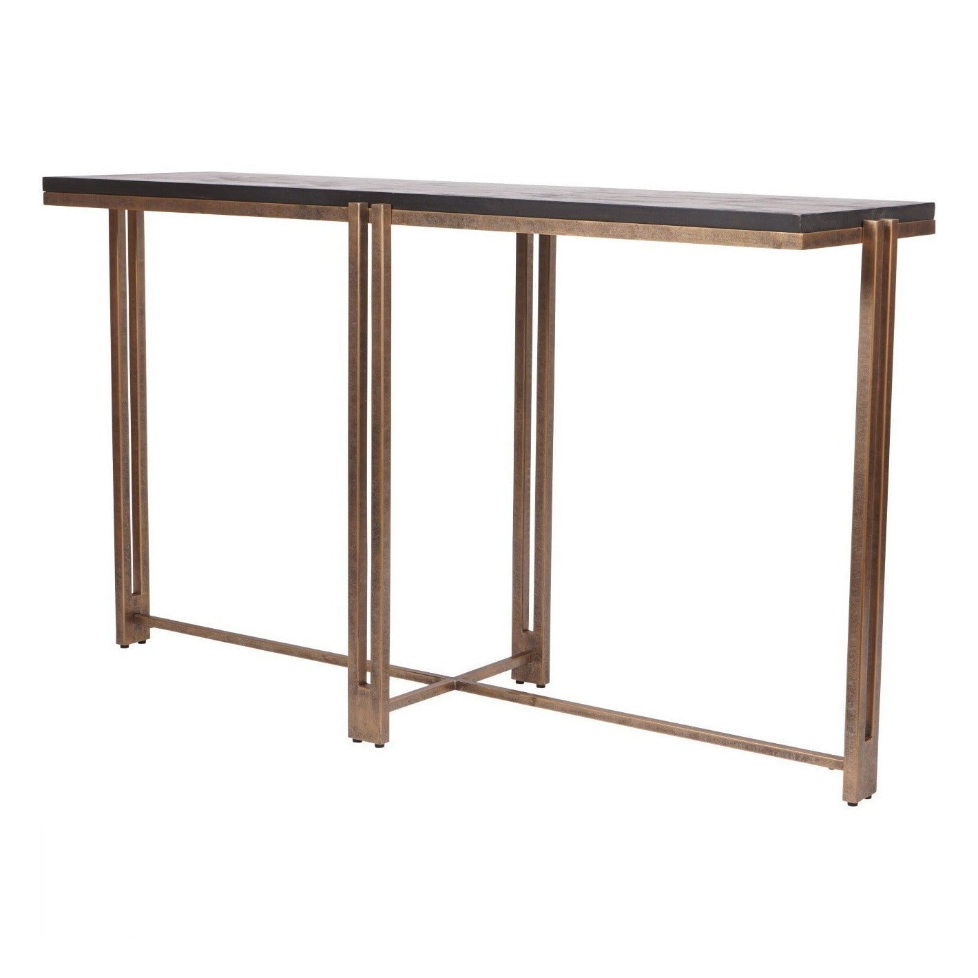 Elevate your space with the Dalston Console Table, a masterful fusion of seasoned mango wood and sandblasted black finished wood. Its sleek geometric design, coupled with a rustic bronze hand-distressed metal frame, delivers a striking yet understated elegance. The sturdy cross-legged support ensures durability while the textured wood grains add a refined touch of rustic charm. Perfectly balancing form and function, the Dalston Console Table is a testament to modern sophistication. This console is the perfect addition to any living room, or hallway. The Dalston collection includes the Console Table, Side Table, and Coffee Table.