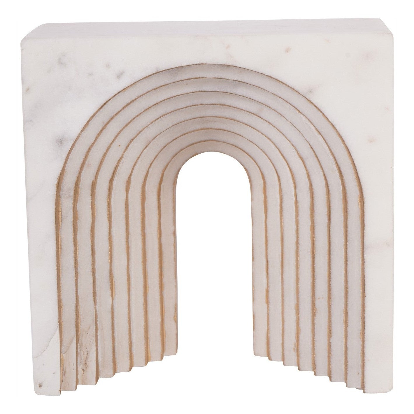 The Genoa White Marble Decorative Sculpture is a handmade piece, expertly carved into a layered arch design, making it a striking statement or a mindful addition to any space. The polished marble, with its subtle grey veining, is beautifully accented by a hand painted gold finish along the layered lines, enhancing its architectural appeal. Clean lines and gold detailing add a dynamic and luxurious quality to its appearance. This collection is complemented by other handmade accessories crafted from the same marble, including bookends, tabletop storage, and wall hooks.
