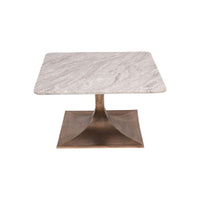 The Square Morchino Coffee Table showcases the stunning elegance of Morchino marble, known for its striking blend of grey and white tones, with subtle veining that creates a sophisticated finish. The natural marble makes every piece unique, and the top rests on a sleek aluminium base finished in antique brass. The Hinton collection is available in side tables in 44 cm and 55 cm sizes, as well as a 70 cm square coffee table. This is natural marble, quarried from mountains in Rajasthan, India. As an organic material, it is prone to variations in colour, pattern and density, all of which are hallmarks of its beauty and charm. Marble is formed from the recrystallization of limestone under intense pressure and high temperatures within the earth over thousands of years. During this process, the minerals introduced into the structure produce the beautiful colours and veining which characterize natural marble and differentiate it from synthetic substitutes. These variations are the essence of one of the world's most beautiful organic materials.