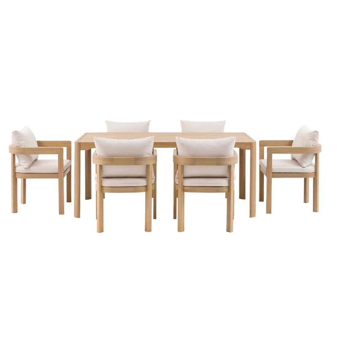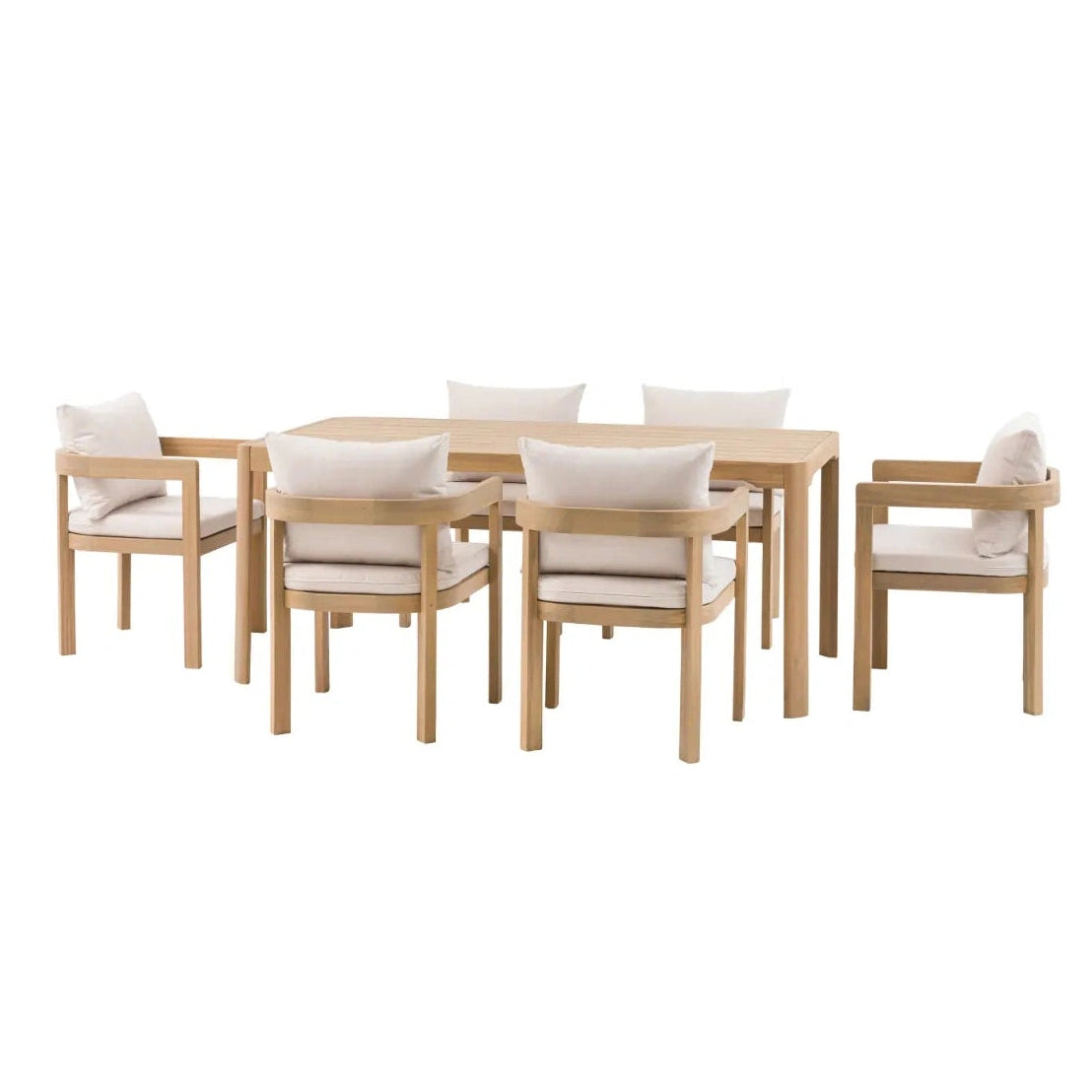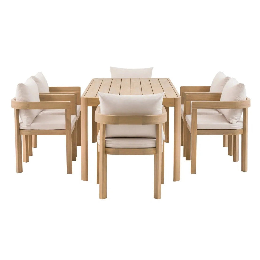 Enjoy the summer sun in style with this modern lounge set. The chic 2 seater sofa, 2 armchairs, side table and coffee table are crafted from beautiful Acacia wood, with sleek soft curves and clean contemporary lines, giving outdoor spaces a modern, elegant update. The sofa and armchairs are topped with deep filled cushions for truly relaxing comfort.