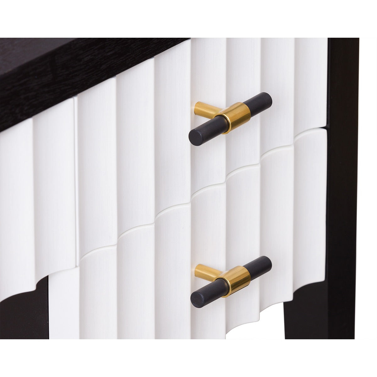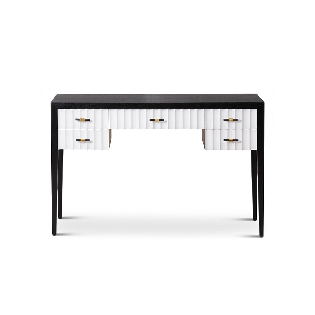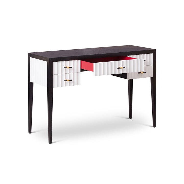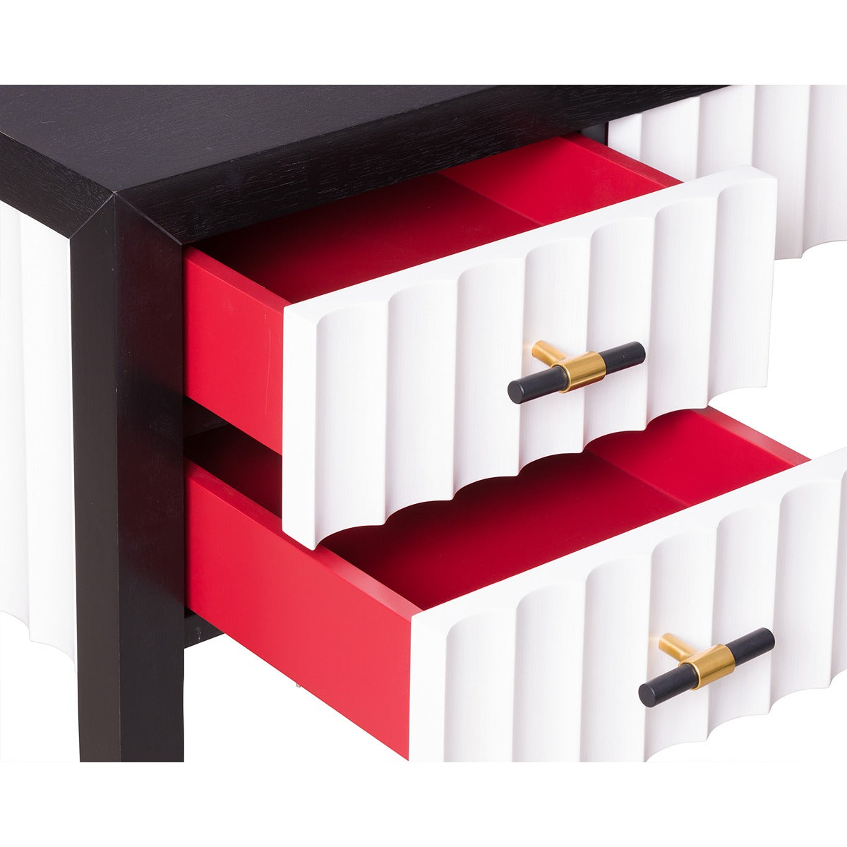 The Malibu Console Table is designed for those who seek understated luxury. Its black satin veneer and hairline antique white detailing pair perfectly with brass and black metal accents. A striking red lining in the drawer adds an unexpected pop of colour, enhancing its sophisticated design. Ideal for creating a welcoming, stylish entryway or as a statement piece in a hospitality environment. Features: Acacia Wood, Hairlined Antique White, Brass, Black Metal, Red Lining.