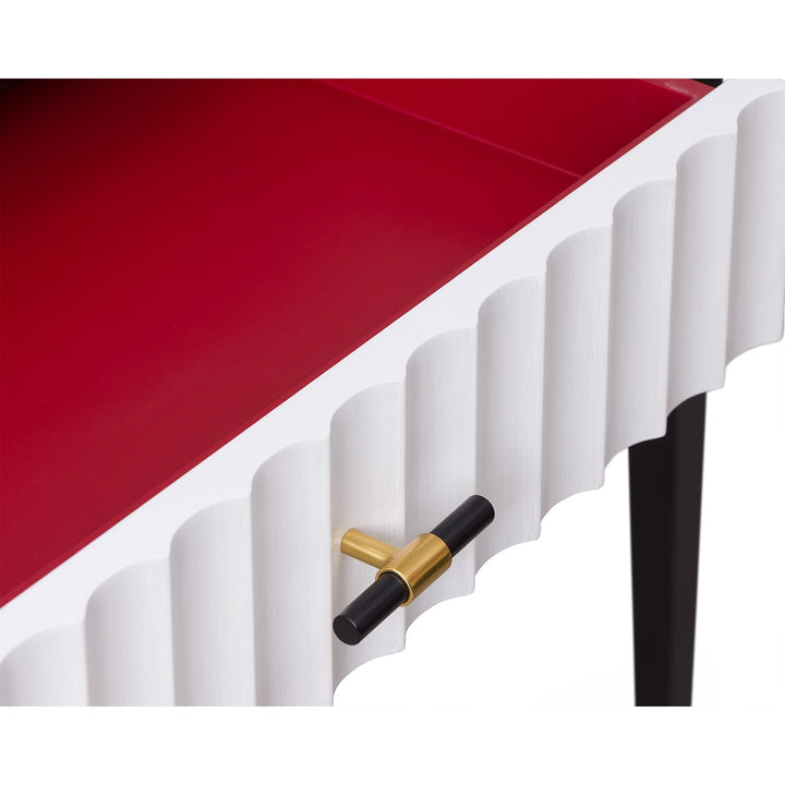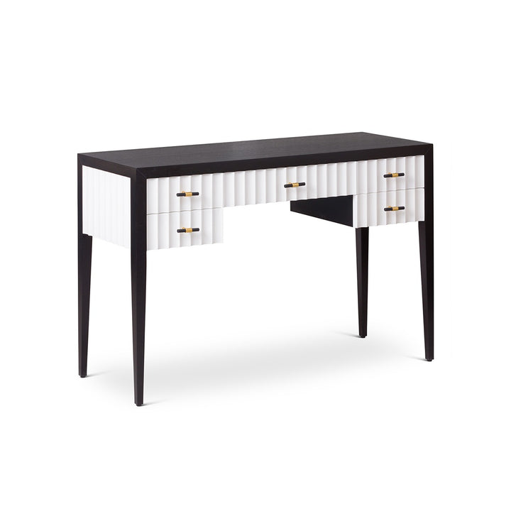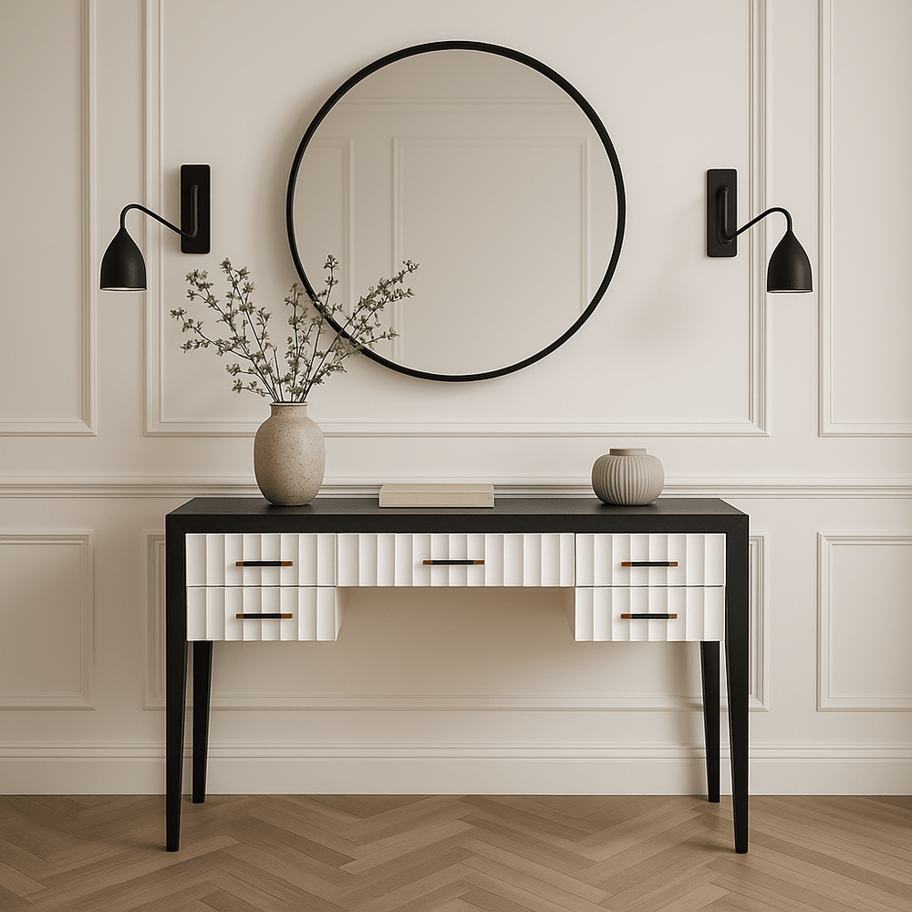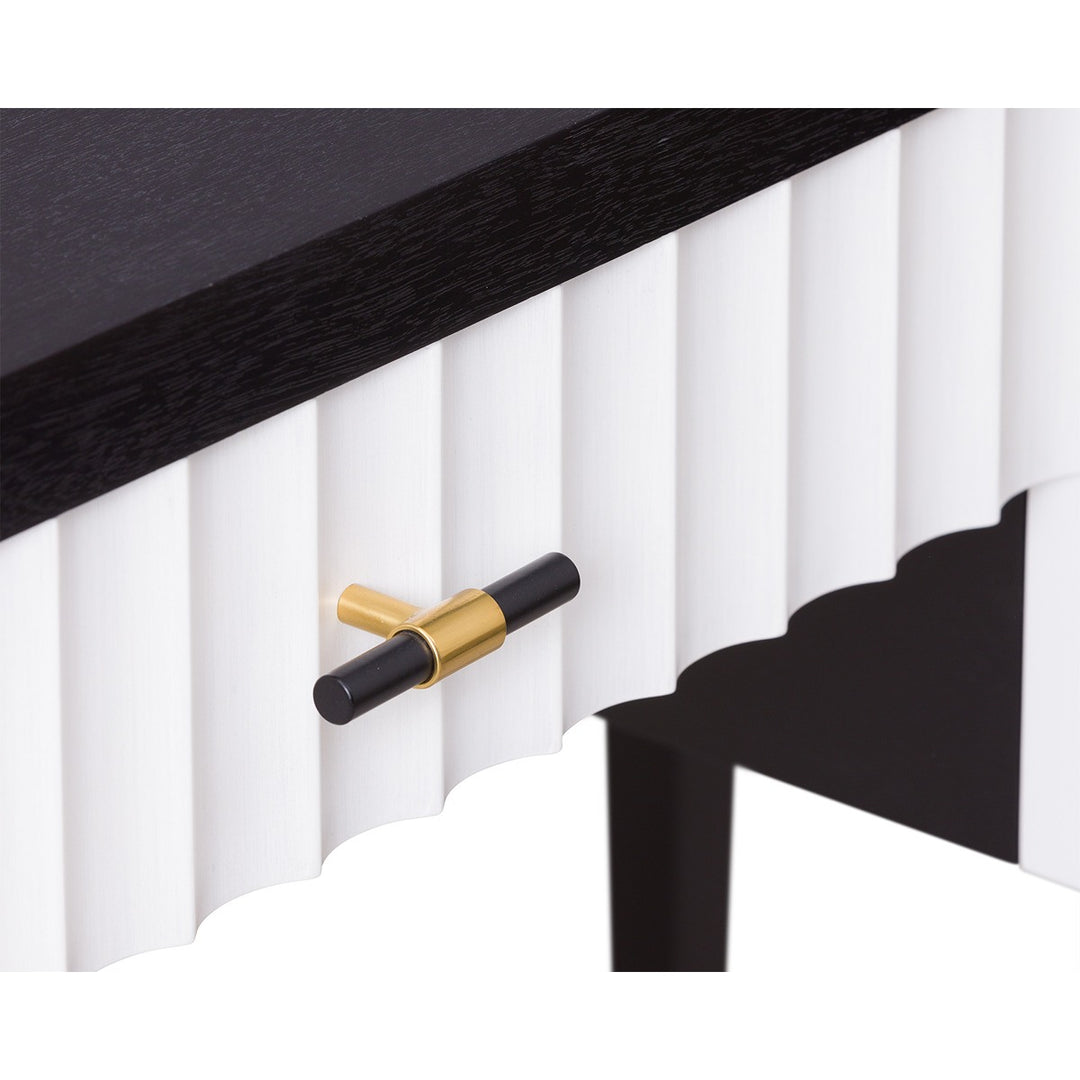 The Malibu Console Table is designed for those who seek understated luxury. Its black satin veneer and hairline antique white detailing pair perfectly with brass and black metal accents. A striking red lining in the drawer adds an unexpected pop of colour, enhancing its sophisticated design. Ideal for creating a welcoming, stylish entryway or as a statement piece in a hospitality environment. Features: Acacia Wood, Hairlined Antique White, Brass, Black Metal, Red Lining.