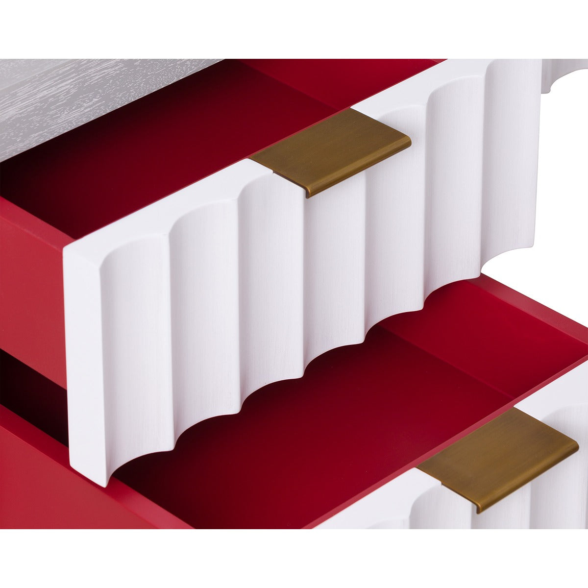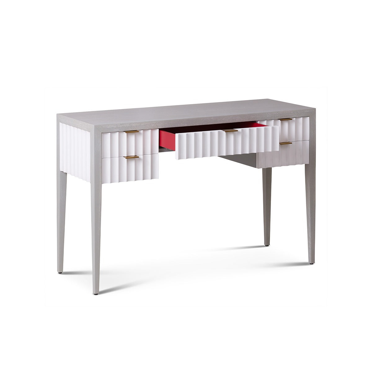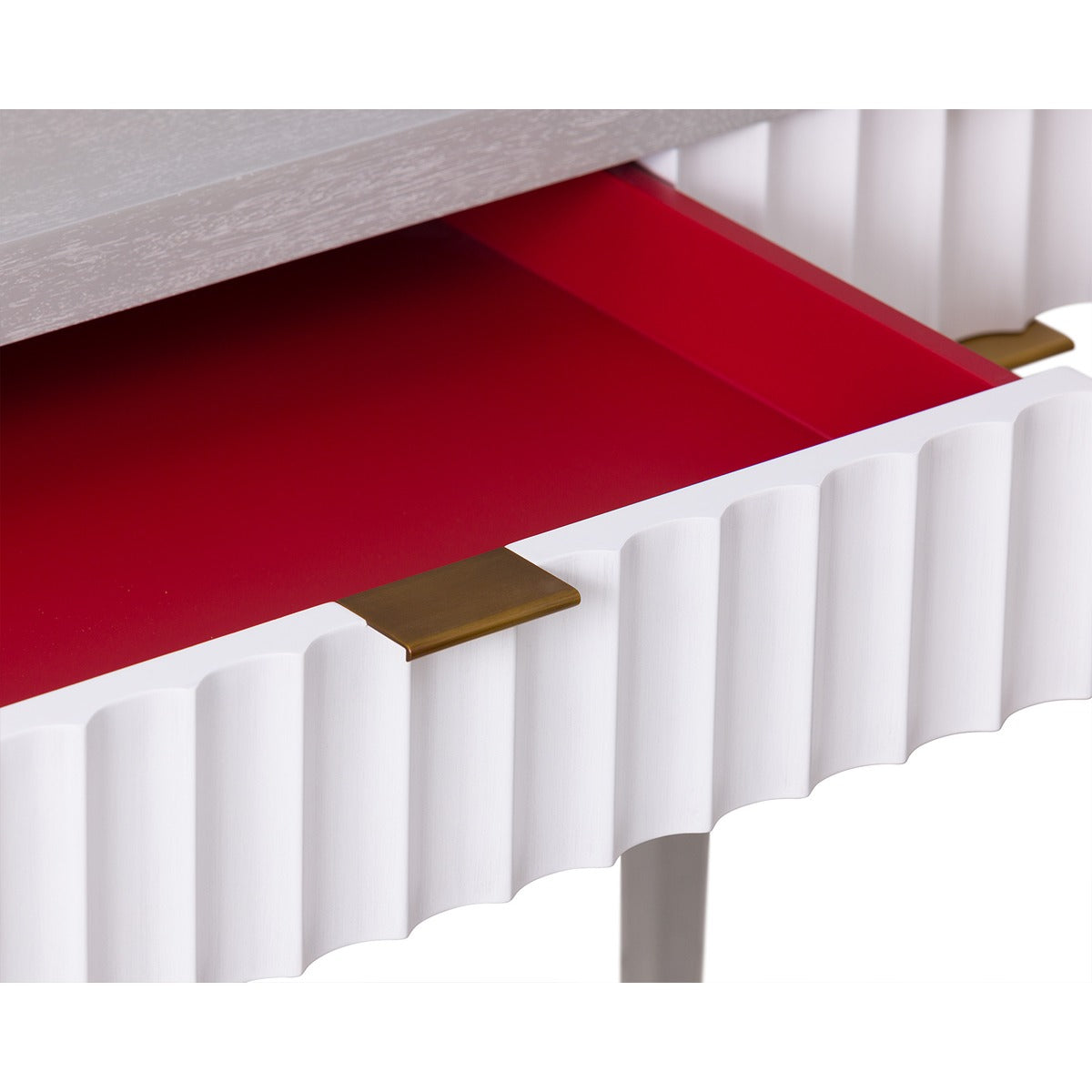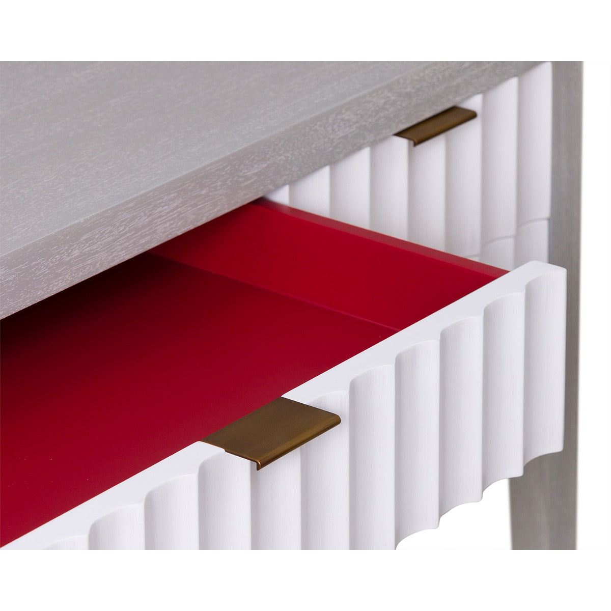 Subtle yet bold, the Malibu 2 Console Table is crafted with grey satin veneer and a refined hairline antique white finish. The brushed brass accents elevate the overall aesthetic, while the striking red-lined drawers add an unexpected touch of vibrancy. This versatile piece is perfect for both residential and commercial use, offering style and function for high-end spaces. Features: Acacia Wood, Hairlined Antique White, Brushed Brass, Red Lining.