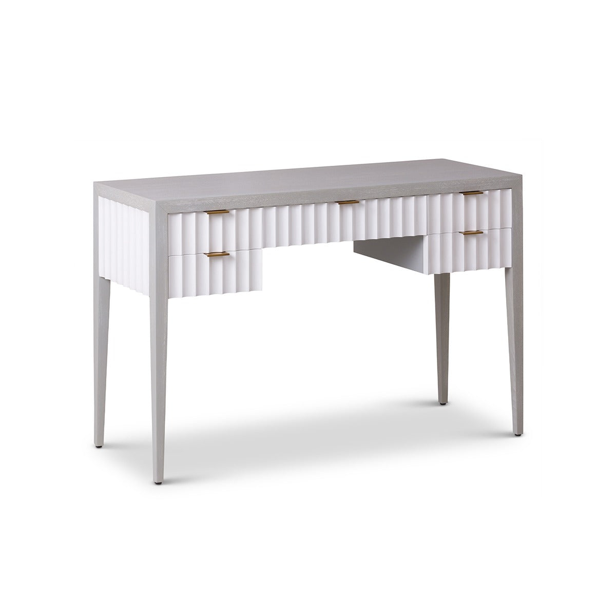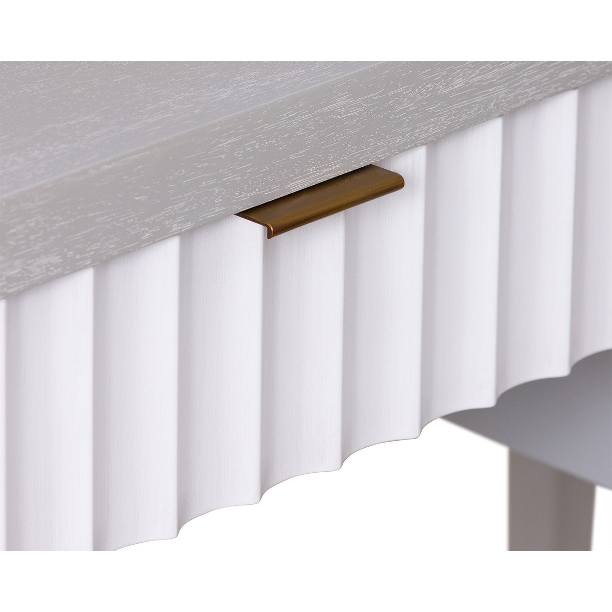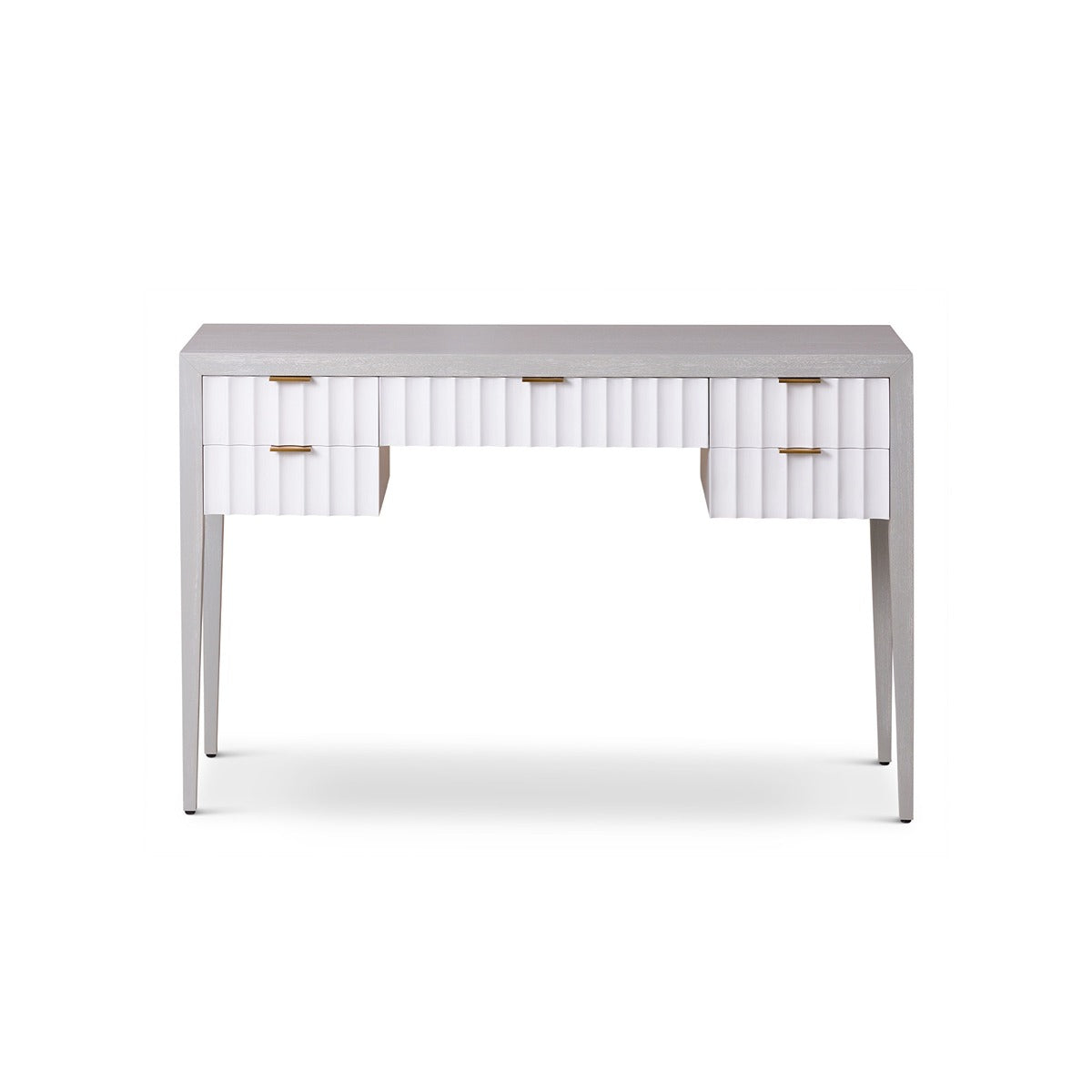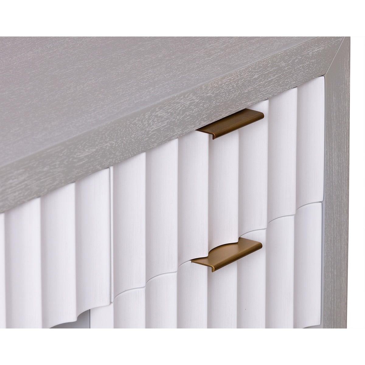 Subtle yet bold, the Malibu 2 Console Table is crafted with grey satin veneer and a refined hairline antique white finish. The brushed brass accents elevate the overall aesthetic, while the striking red-lined drawers add an unexpected touch of vibrancy. This versatile piece is perfect for both residential and commercial use, offering style and function for high-end spaces. Features: Acacia Wood, Hairlined Antique White, Brushed Brass, Red Lining.