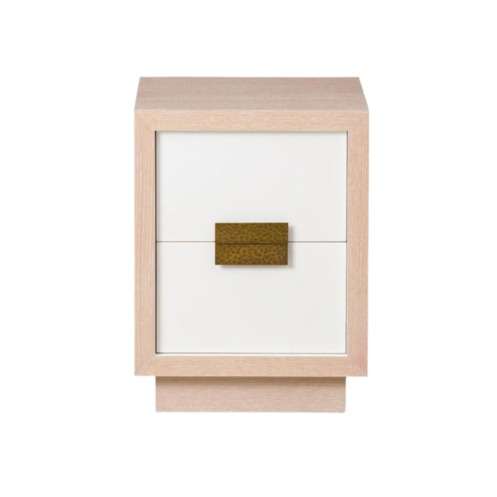 The Manila Bedside Table offers a refined touch to any room. Its natural white oak finish provides a warm, neutral base, while antique brass handles give it a sophisticated, timeless look. Perfect for creating an inviting atmosphere in both contemporary homes and luxury hotel rooms. Features: Oak Wood, Antique Brass.