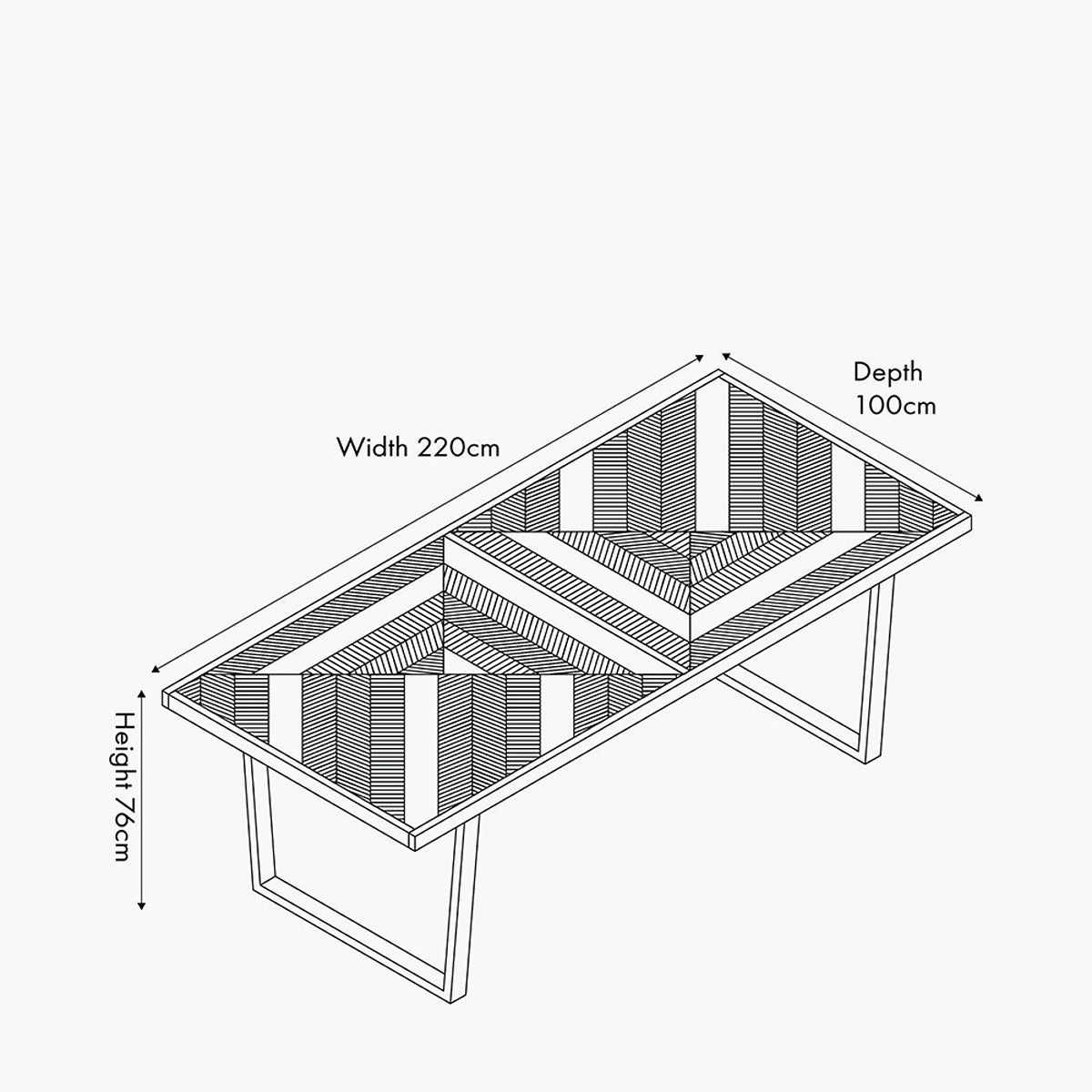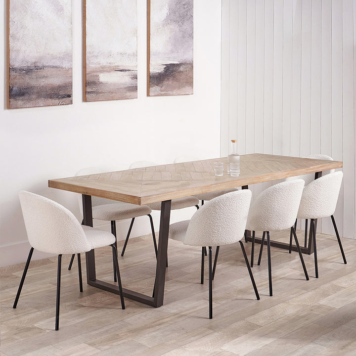 Elevate your dining space with our Marcine Acacia Wood dining table. Designed with clean Scandi lines, textured panelling, and industrial inspired legs, it brings a touch of sophistication to any room. The large dining table will comfortably fit 8 seats around it for those bigger gatherings.