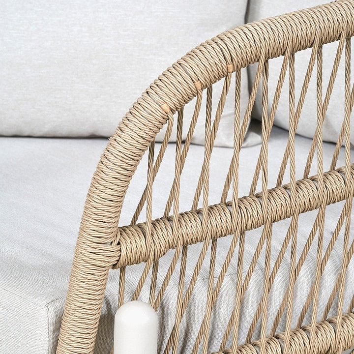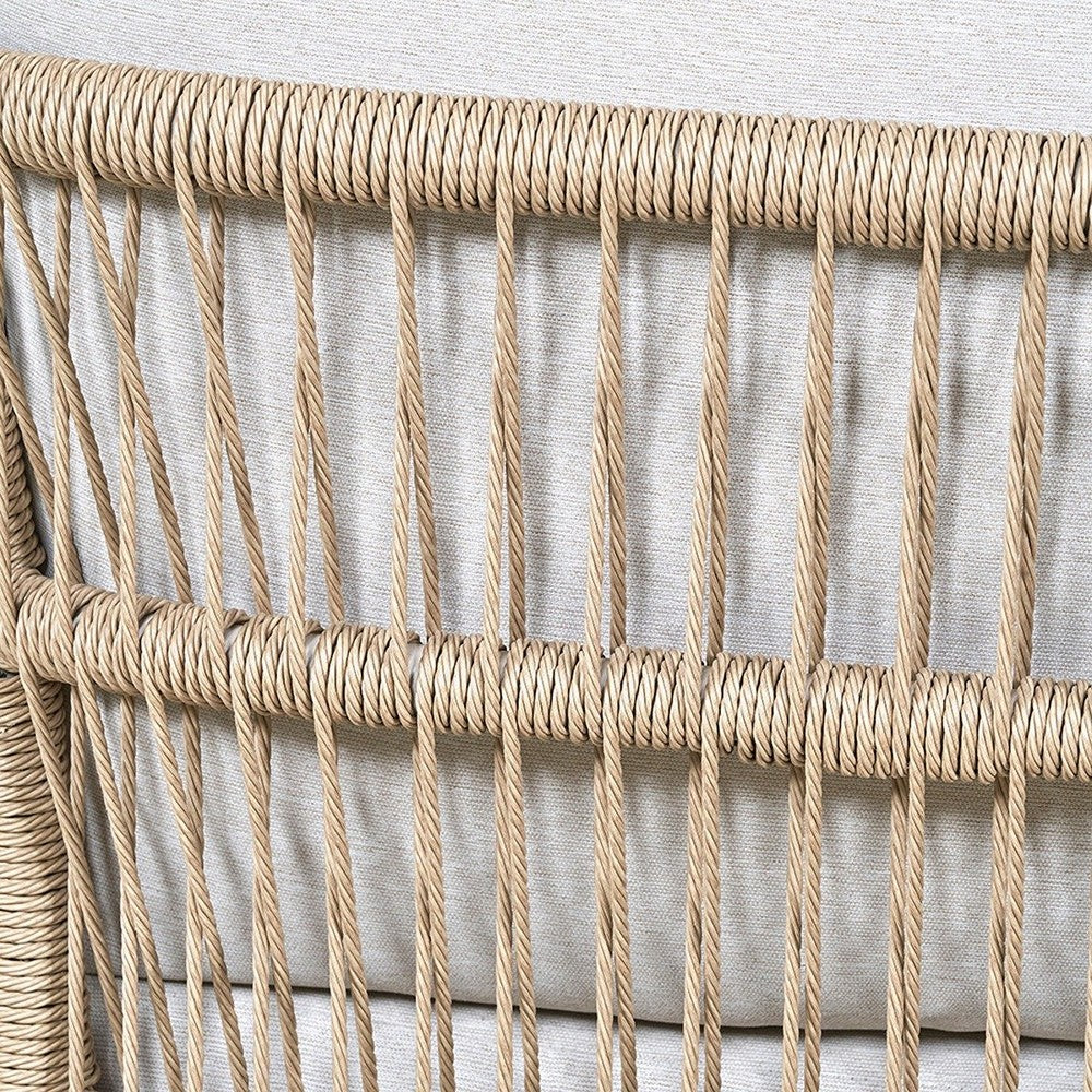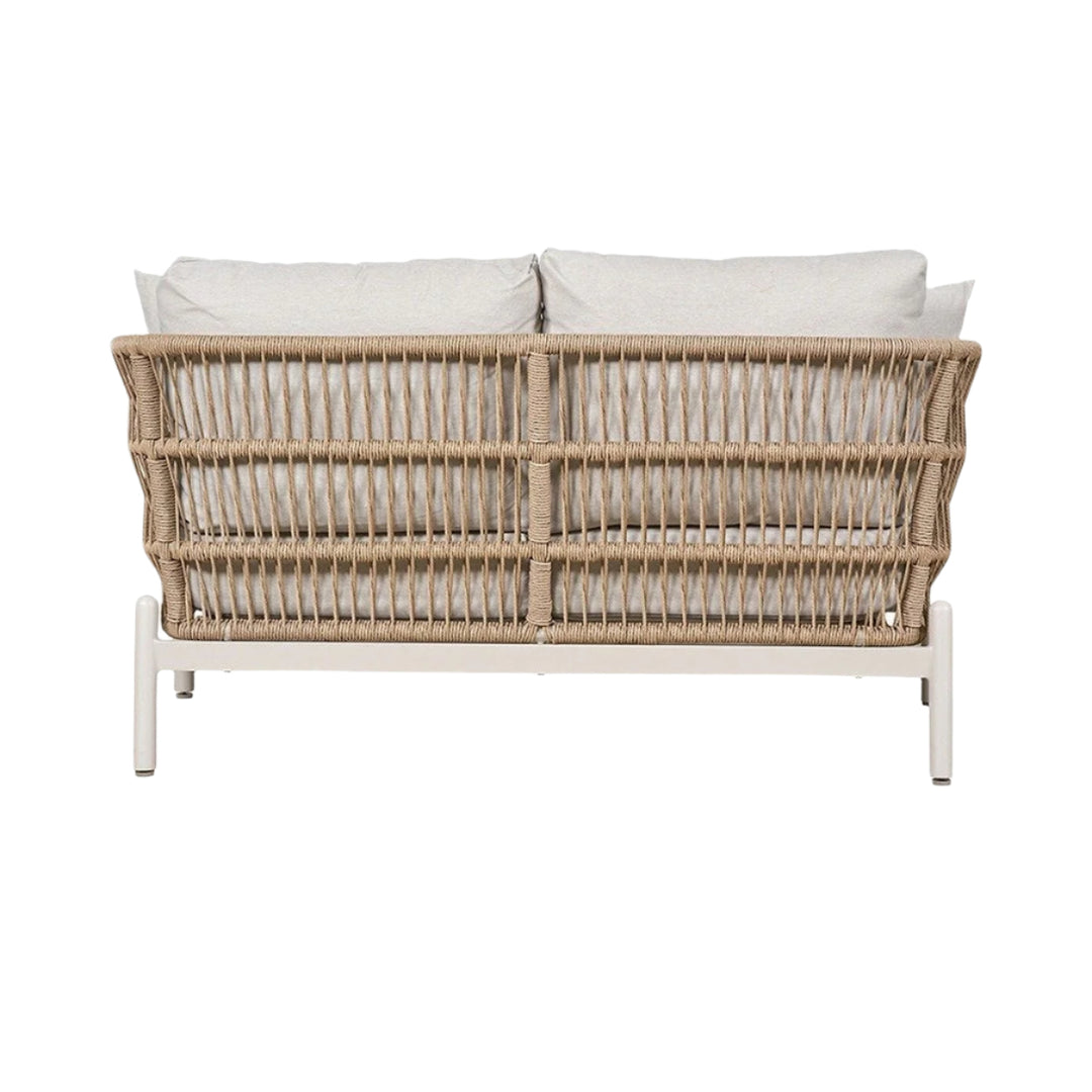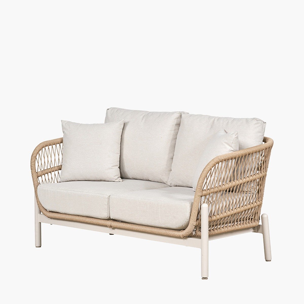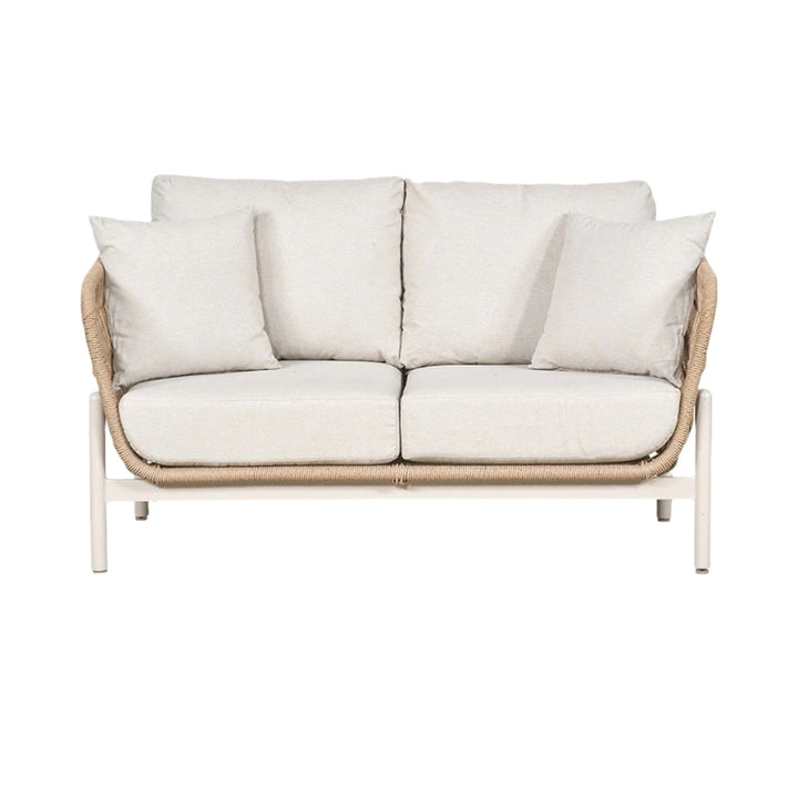 The contemporary Maria Outdoor 2 Seater Sofa is designed to offer the ultimate lounging experience. You can buy this piece in multiples and pair it with your choice of side or coffee tables to create a bespoke bistro setup tailored to your outdoor space. This 2 Seater outdoor Sofa features a Natural Synthetic Core Weave and a durable, Latte-coloured, powder-coated aluminium frame. It’s complemented by seat and back cushions in Light Putty Olefin fabric, a popular choice in outdoor furniture for its synthetic fibres that resist staining, fade, and dry quickly, making it ideal for outdoor use. This set is elevated with additional scatters for enhanced comfort.