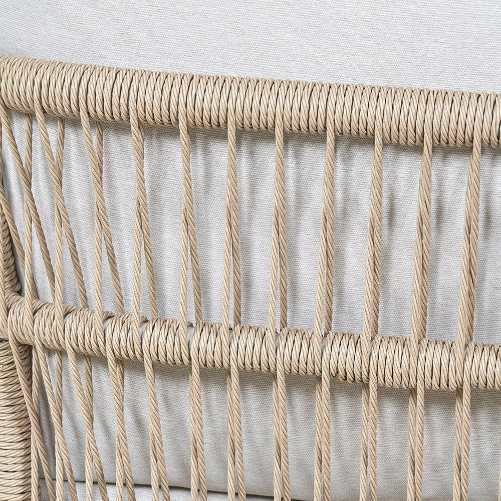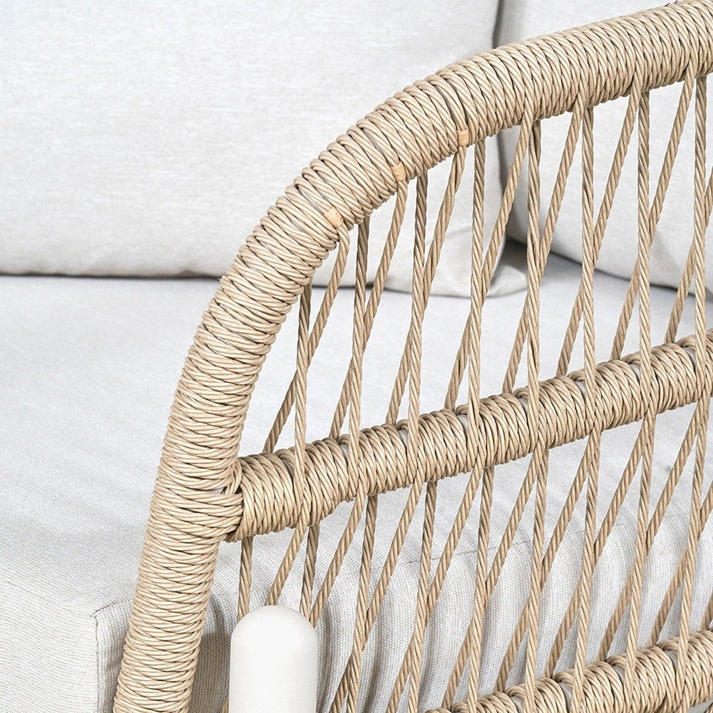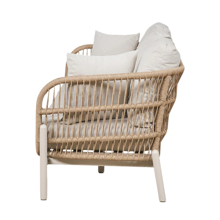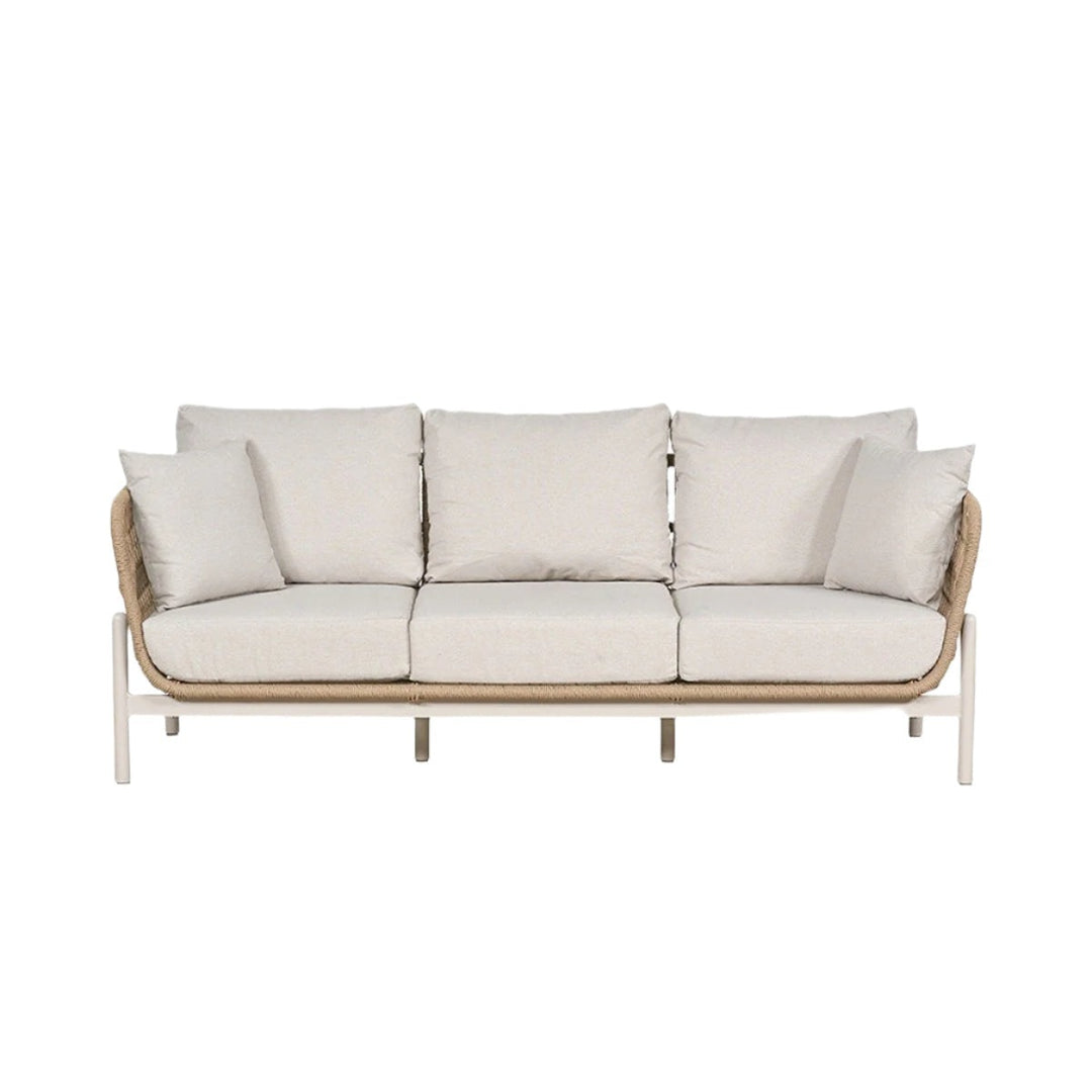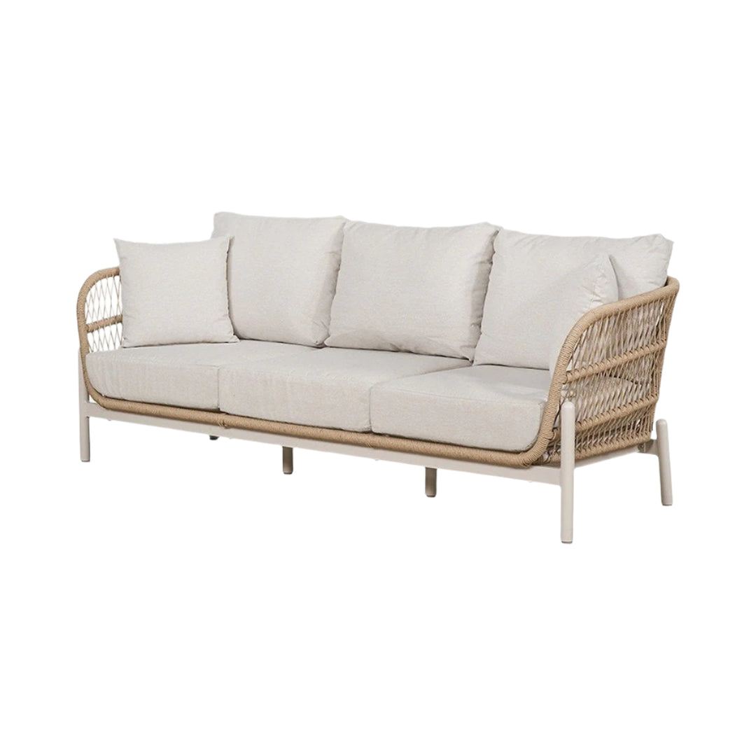 The contemporary Maria Outdoor 3 Seater Sofa is designed to offer the ultimate lounging experience. You can buy this piece in multiples and pair it with your choice of side or coffee tables to create a bespoke bistro setup tailored to your outdoor space. This 3 Seater outdoor Sofa features a Natural Synthetic Core Weave and a durable, Latte-coloured, powder-coated aluminium frame. It’s complemented by seat and back cushions in Light Putty Olefin fabric, a popular choice in outdoor furniture for its synthetic fibres that resist staining, fade, and dry quickly, making it ideal for outdoor use. This set is elevated with additional scatters for enhanced comfort.