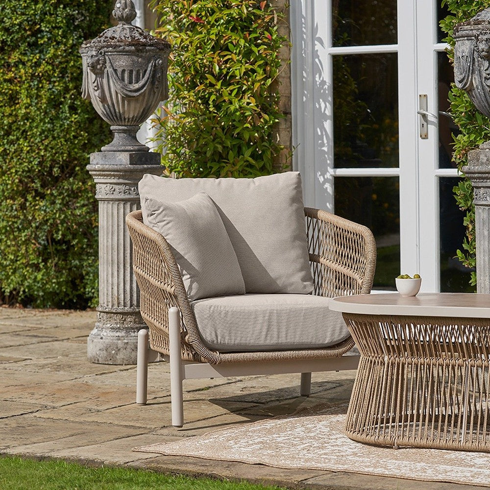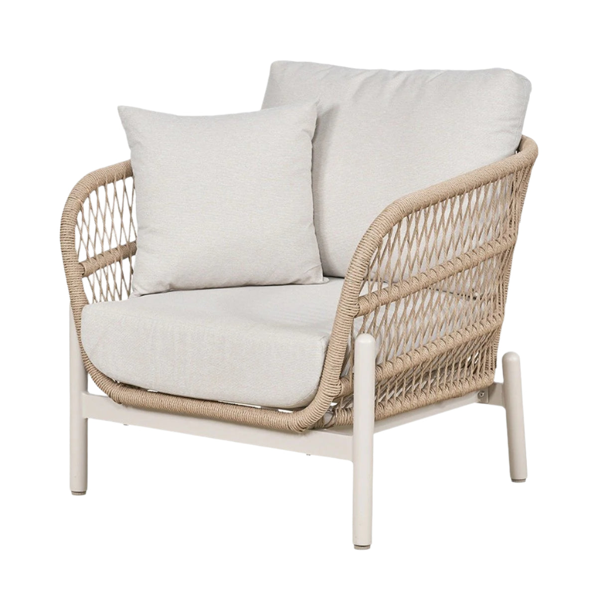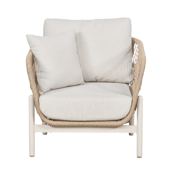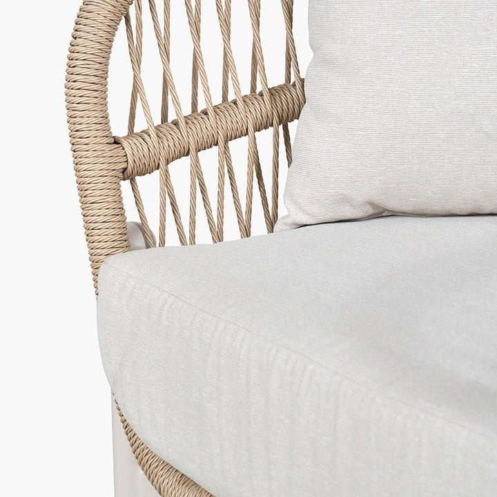The contemporary Maria Outdoor Armchair is designed to offer the ultimate lounging experience. You can buy this piece in multiples and pair it with your choice of side or coffee tables to create a bespoke bistro setup tailored to your outdoor space. This Armchair features a Natural Synthetic Core Weave and a durable, Latte-coloured, powder-coated aluminium frame. It’s complemented by seat and back cushions in Light Putty Olefin fabric, a popular choice in outdoor furniture for its synthetic fibres that resist staining, fade, and dry quickly, making it ideal for outdoor use. This set is elevated with additional scatters for enhanced comfort.
